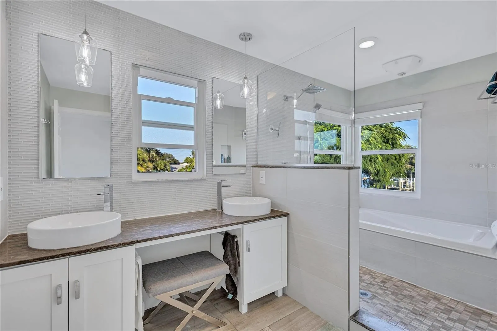 Welcome to your dream waterfront home, perfectly designed for both relaxed family living and effortless entertaining. This spacious residence offers a versatile layout and breathtaking open-water views of the bay from nearly every room. The upstairs primary suite is a true retreat—featuring two expansive walk-in closets, a private sitting area, and a luxurious ensuite with a garden tub, separate shower, and private water closet. Step out onto the large balcony to enjoy stunning bay views and refreshing coastal breezes. Downstairs, you’ll find a second ensuite bedroom with a walk-in closet, plus two additional bedrooms and a full bath on the opposite side of the home—one with direct access to a waterfront patio. From the living room, dining room, and kitchen, the water views are simply captivating. The interior showcases gorgeous tile flooring throughout the kitchen, dining, and living spaces, along with beautiful built-in bookshelves and a separate dining room. Storage is abundant with generous closet space throughout. Additional highlights include a two-car garage with a hurricane-rated door and straps, newer impact windows and sliders (including 12’, 8’, and 16’ sliders for seamless access to the backyard), and a newer metal roof with a lifetime warranty, hurricane strapping, and a reflective, self-healing barrier. This property remained high and dry through recent storms. Outdoor living shines with a covered lanai spanning the length of the home, a maintenance-free yard, and a private cove that enhances privacy while keeping boat traffic minimal—often visited by manatees. Enjoy fishing from your dock or pull up your boat or jet ski to the floating dock or davits. Located just 3 miles from downtown St. Petersburg, this vibrant waterfront community features a park with pickleball, tennis, basketball, soccer fields, dog parks, and a scenic waterfront walking trail. Just off the island, you’ll find two great restaurants, two coffee shops, and a local gathering spot. Ride your bike to downtown, nearby beaches or state parks, If you don’t feel like driving downtown, just hop in your boat and cruise over—there’s plenty of boat parking waiting when you get there! Head in the opposite direction you’ll be out to the Gulf in no time. Deep water access makes this the perfect spot for your sailboat or powerboat. This home truly combines the best of waterfront luxury, comfort, and convenience in one stunning package.