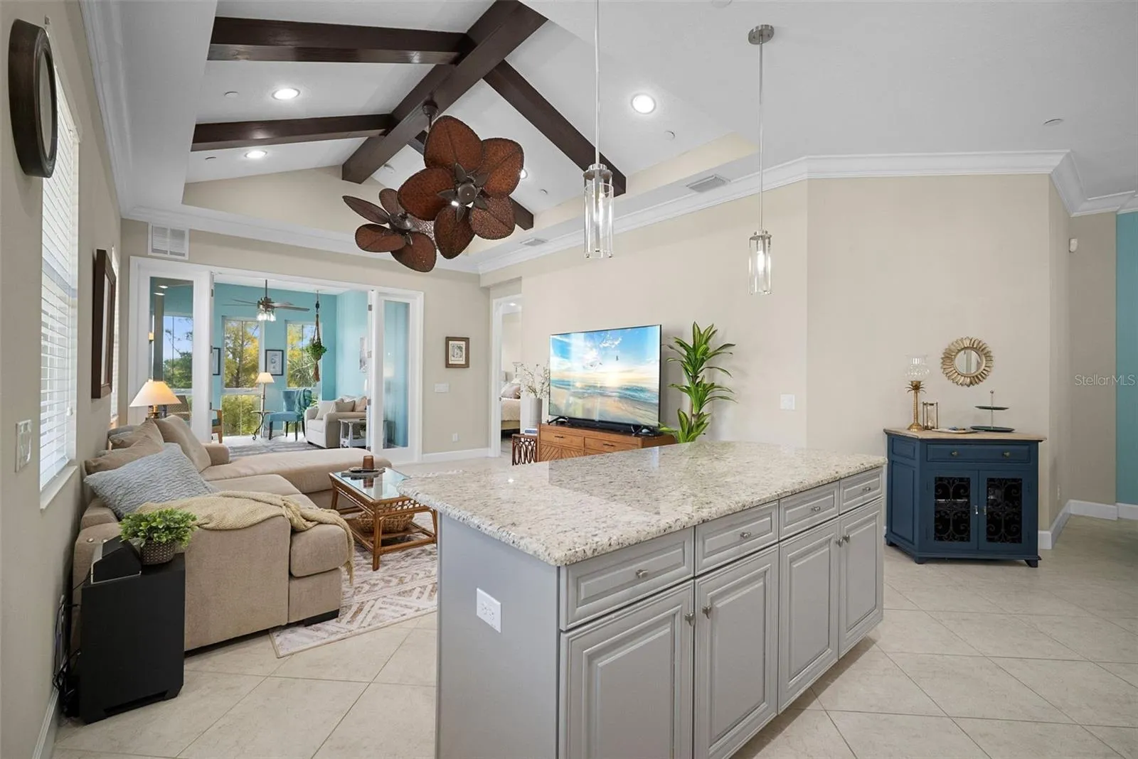 The chef’s kitchen is both elegant and functional, featuring GE Café stainless steel appliances, granite countertops, a large island with breakfast bar, and linen-hued custom cabinetry.