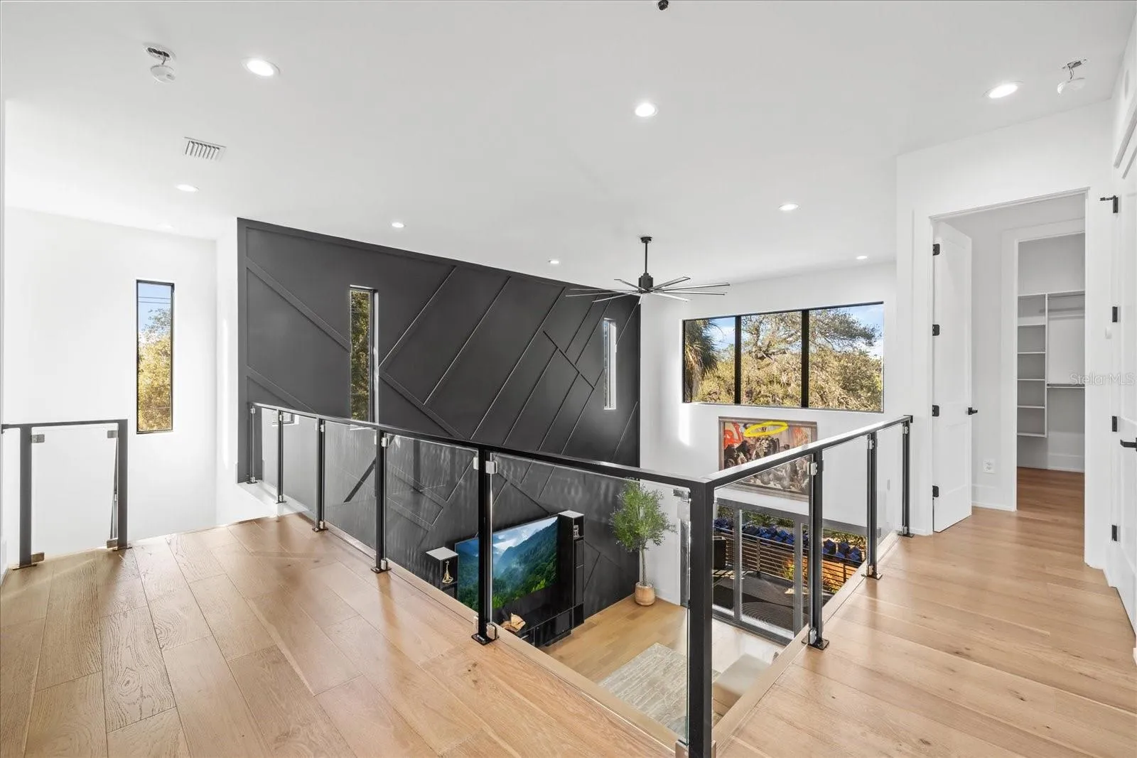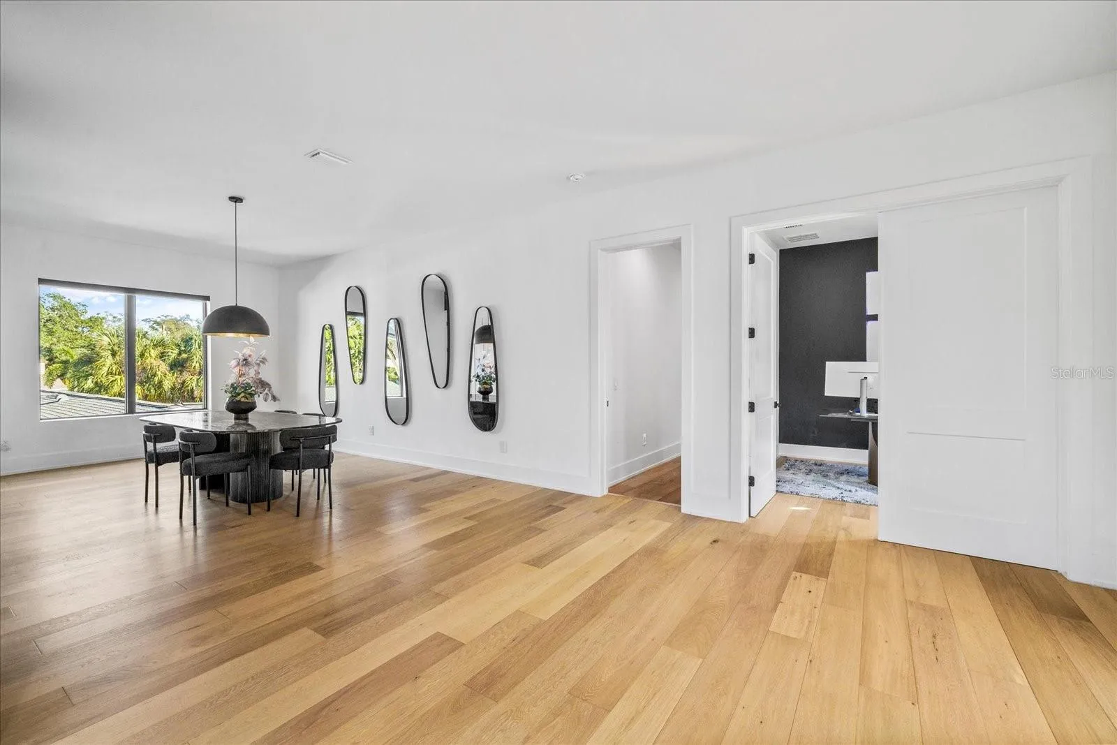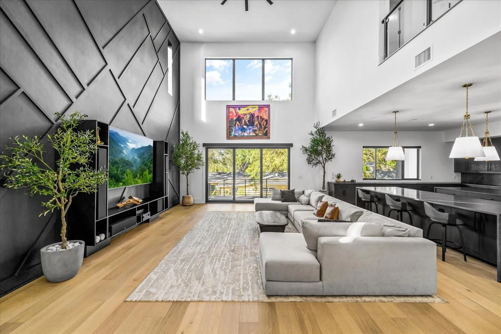 Located in the heart of Sunset Park, this modern South Tampa residence offers 4 bedrooms, 4.5 baths, and more than 4,600 square feet of beautifully designed living space. This 3 story home showcases a clean, contemporary aesthetic with impressive upgrades throughout. The main level features an open layout anchored by a spacious family room with a custom accent wall and a chef’s kitchen with double waterfall islands, sleek black cabinetry, professional ZLINE appliances, and a wine bar with refrigeration. Brand new European Oak hardwood flooring enhances the entire downstairs, creating a warm contrast to the modern finishes, and upgraded electric window shades provide added comfort and privacy. The main level also includes a dining room, office, and powder bath.