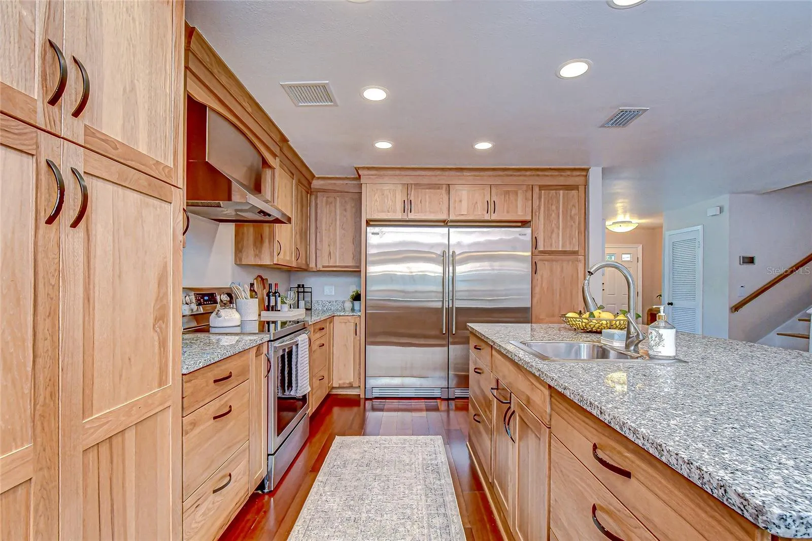 Nothing short of amazing! This beautifully updated 4-bedroom, 3-bath home offers approximately 2,200 square feet of living space on an oversized corner lot in the highly desirable Bloomingdale community. Step into the welcoming foyer, where the formal living room sits to your right—ideal as a home office or flexible living space. The updated kitchen features wood cabinetry with pullout shelving and soft-close drawers, granite countertops, a large center island, and a breakfast bar—perfect for entertaining and everyday culinary enjoyment. Premium Electrolux appliances include a full-size refrigerator and matching full-size freezer, range hood, convection oven, microwave, and dishwasher. Adjacent to the kitchen, the spacious family room boasts a wood-burning fireplace and overlooks the screened-in paver patio and brand-new wood deck that spans the back of the home—an ideal setting for relaxation and gatherings. Upstairs, the primary suite offers a private, updated bathroom with granite countertops, dual sinks, a large walk-in shower, custom vanity, and a generous walk-in closet. Two additional bedrooms share a beautifully appointed full bath with a tub/shower combo and custom vanity. A versatile fourth bedroom is located on the lower level and includes its own full bathroom—perfect for guests, a mother-in-law suite, home office, or flex space. The large backyard provides ample room for outdoor enjoyment, gardening, or future enhancements. Metal Roof with solar panels that are paid in full. Double pane windows throughout. Hardieboard siding. This home is conveniently located near major highways, shopping, medical facilities, and restaurants, and it sits within one of the most sought-after school districts. It also offers quick access to downtown Tampa, Disney, Orlando, Sarasota, St. Petersburg, and more. A must-see to truly appreciate!