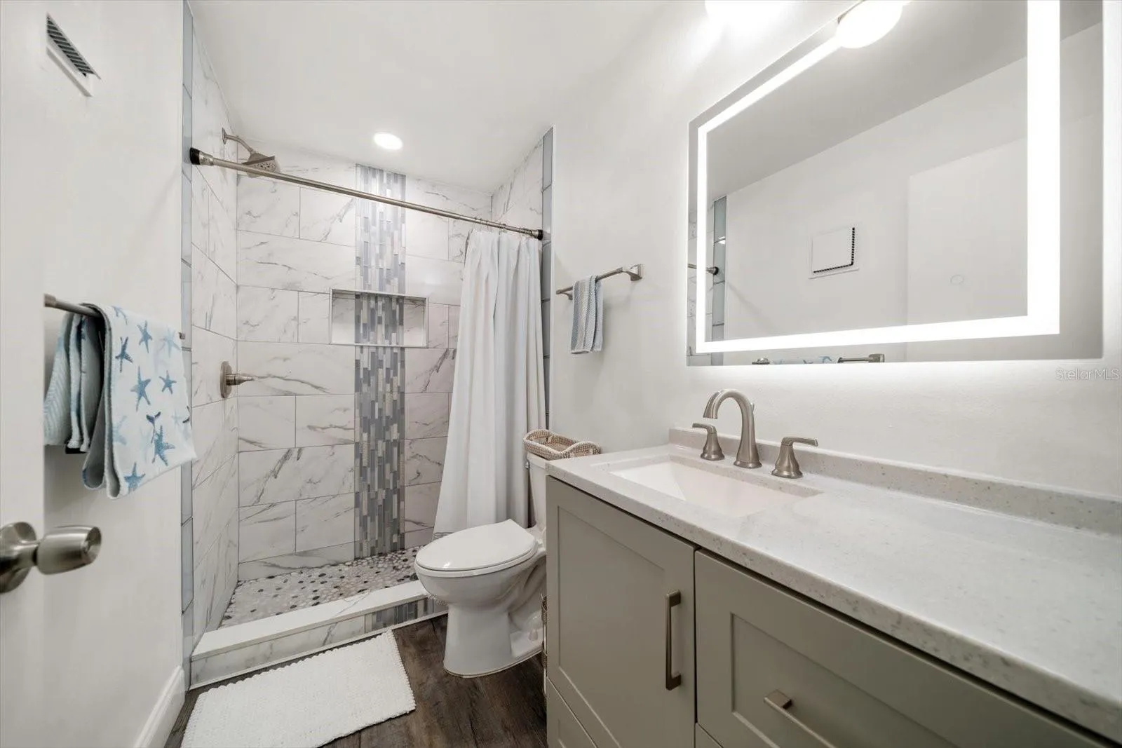 Welcome to this beautifully renovated, move-in ready villa tucked quietly and privately within the desirable Timberwoods community in Seminole. From the moment you step inside, the bright and stylish interior makes an impression, beginning with a stunning white kitchen featuring granite countertops, a custom tile backsplash, stainless steel appliances, and a designer ceiling that adds a touch of sophistication. The spacious family room boasts vaulted ceilings and sliders that open to a screened patio overlooking peaceful greenspace—perfect for relaxing mornings or evening gatherings. The primary bedroom offers comfort and privacy with a large walk-in closet and an updated ensuite showcasing a custom-tiled walk-in shower. The additional bedroom is equally spacious and bright, complete with a generous walk-in closet, and shares an updated hall bath with a tub/shower combo. Timberwoods residents enjoy excellent schools and fantastic community amenities including a sparkling pool, clubhouse, tennis courts, and pickleball. Ideally located near dining, shopping, and the area’s beautiful beaches, this villa offers both convenience and an exceptional lifestyle.