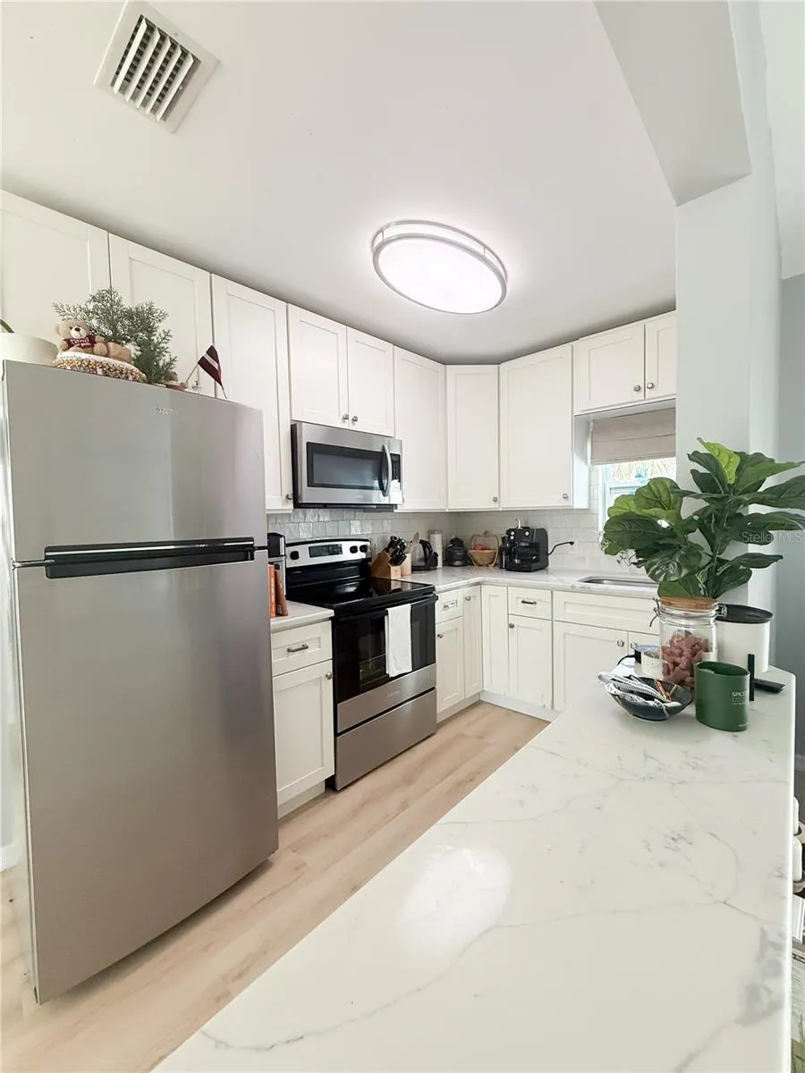 Both units have been thoughtfully updated with impact windows, doors, and sliders for peace of mind and long-term durability. The kitchens feature brand-new stainless steel appliances, stunning quartz countertops, and 42″ solid wood cabinetry. The bathrooms continue the high-end feel with a solid wood dual vanity topped with quartz and a subway-tiled tub surround accented with designer detail.