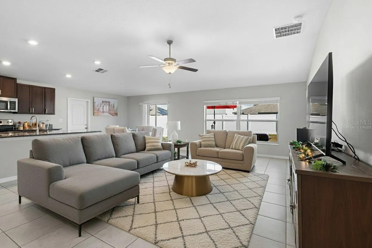 As you enter, the open floor plan and large windows throughout the living spaces bring in loads of natural daylight. The kitchen features ample granite counter space, beautiful dark cabinetry, a spacious pantry, stainless steel appliances, a water filtration system, and extended countertops perfect for additional barstool seating. The split-bedroom layout offers excellent privacy for family or guests. The primary bedroom comfortably fits a king-size bed and includes a huge walk-in closet and an en-suite bathroom with double sinks and a standalone shower. Across the family room are three sizeable secondary bedrooms and a guest bathroom. The laundry room is conveniently located near the garage entry, and the large two-car garage keeps your vehicles protected year-round.