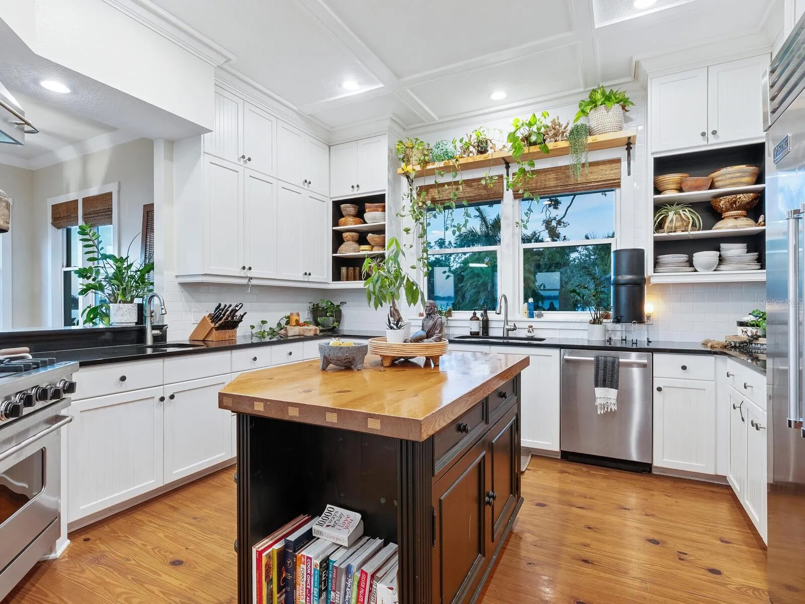 Set on nearly one acre of lush, park-like grounds, the property feels like a secluded Old Florida sanctuary. Ancient 100+ year-old live oaks, breezy palms, and tropical gardens create a meditative backdrop that enhances the home’s peaceful, retreat-like atmosphere.