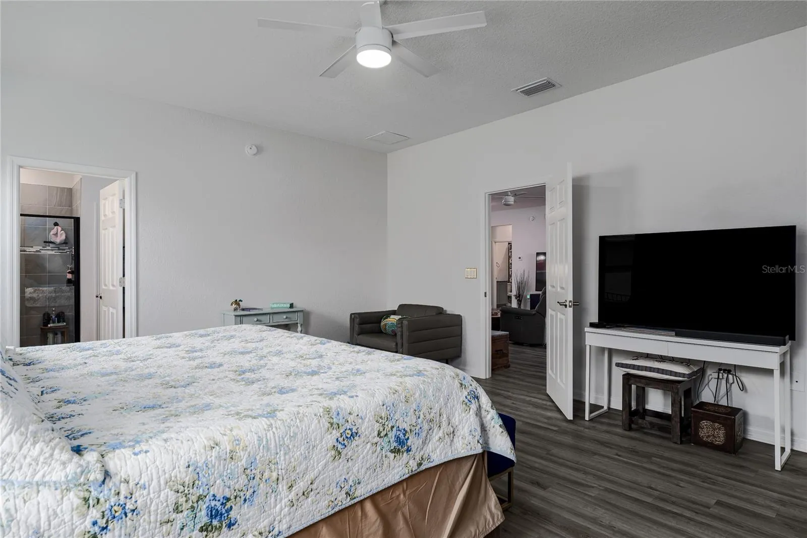 - Ceiling Fans(s), Open Floorplan, Thermostat, Walk-In Closet(s), Primary Bedroom Main Floor, Split Bedroom, High Ceilings, Solid Surface Counters, In Wall Pest System