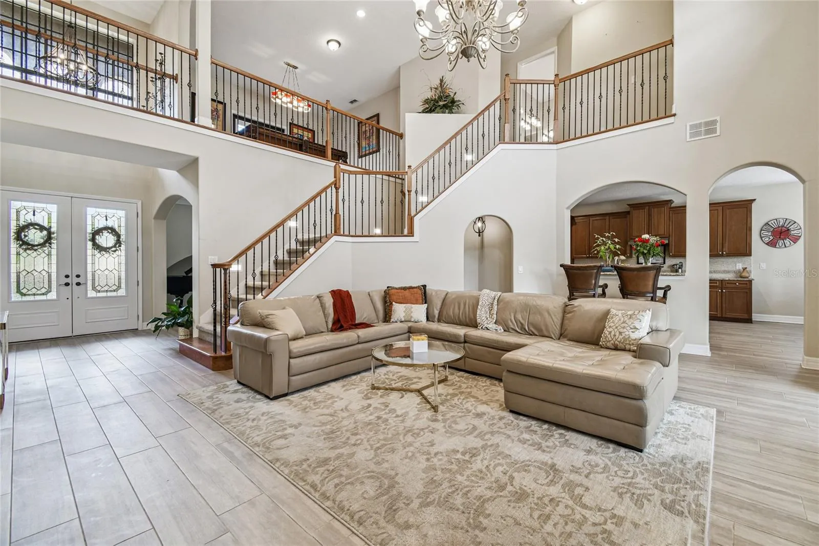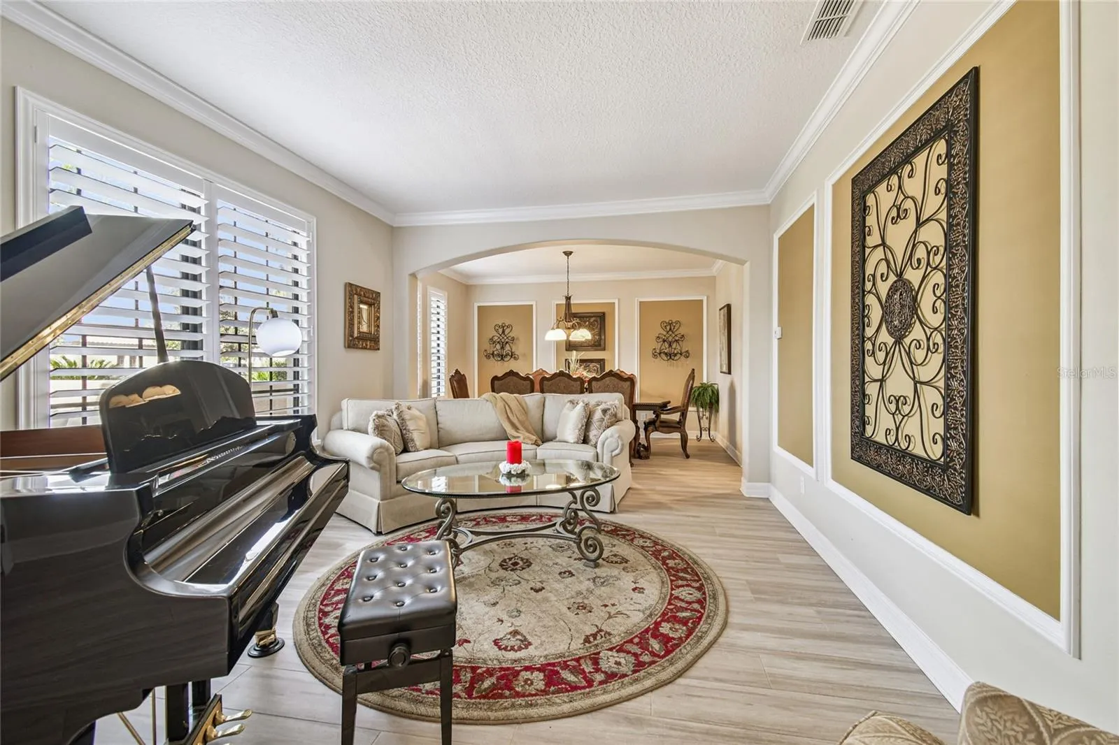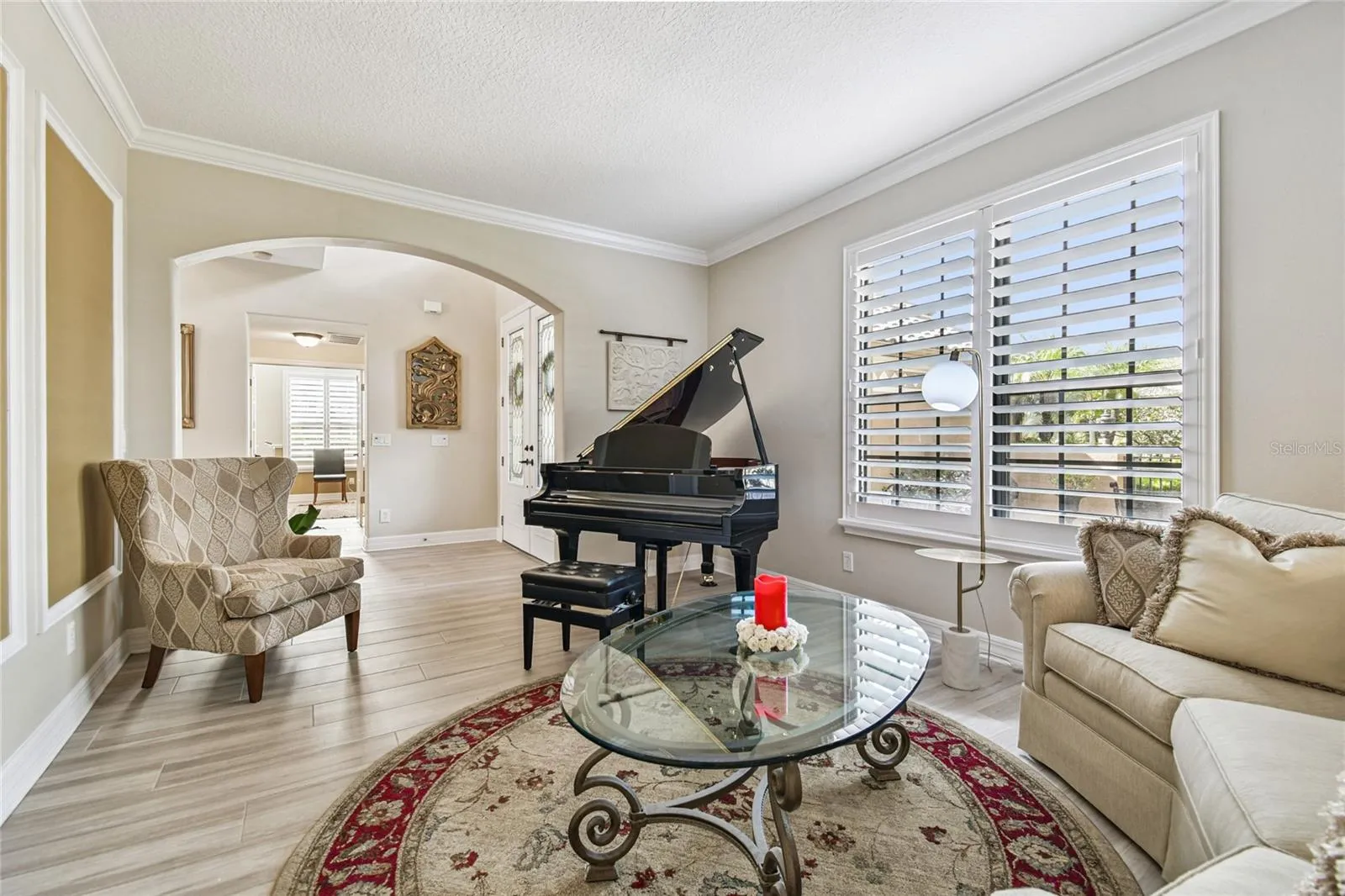 Set on a premium site, this property welcomes you with open spaces, 10–20 ft ceilings, elegant design details, such as crown molding and deep baseboards, featuring custom plantation shutters throughout, a warm, classic feel wraps around you. The open-concept layout offers seamless flow, upgraded ceramic plank wood style tile flooring, custom paint, upgraded designer lighting, and a beautiful staircase with wrought iron balusters. The main living area opens fully to the outdoors through expansive al fresco sliding glass doors, creating a seamless indoor-outdoor living experience overlooking the tropical heated pool, spa, and brick paver deck with room for entertainment and privacy.