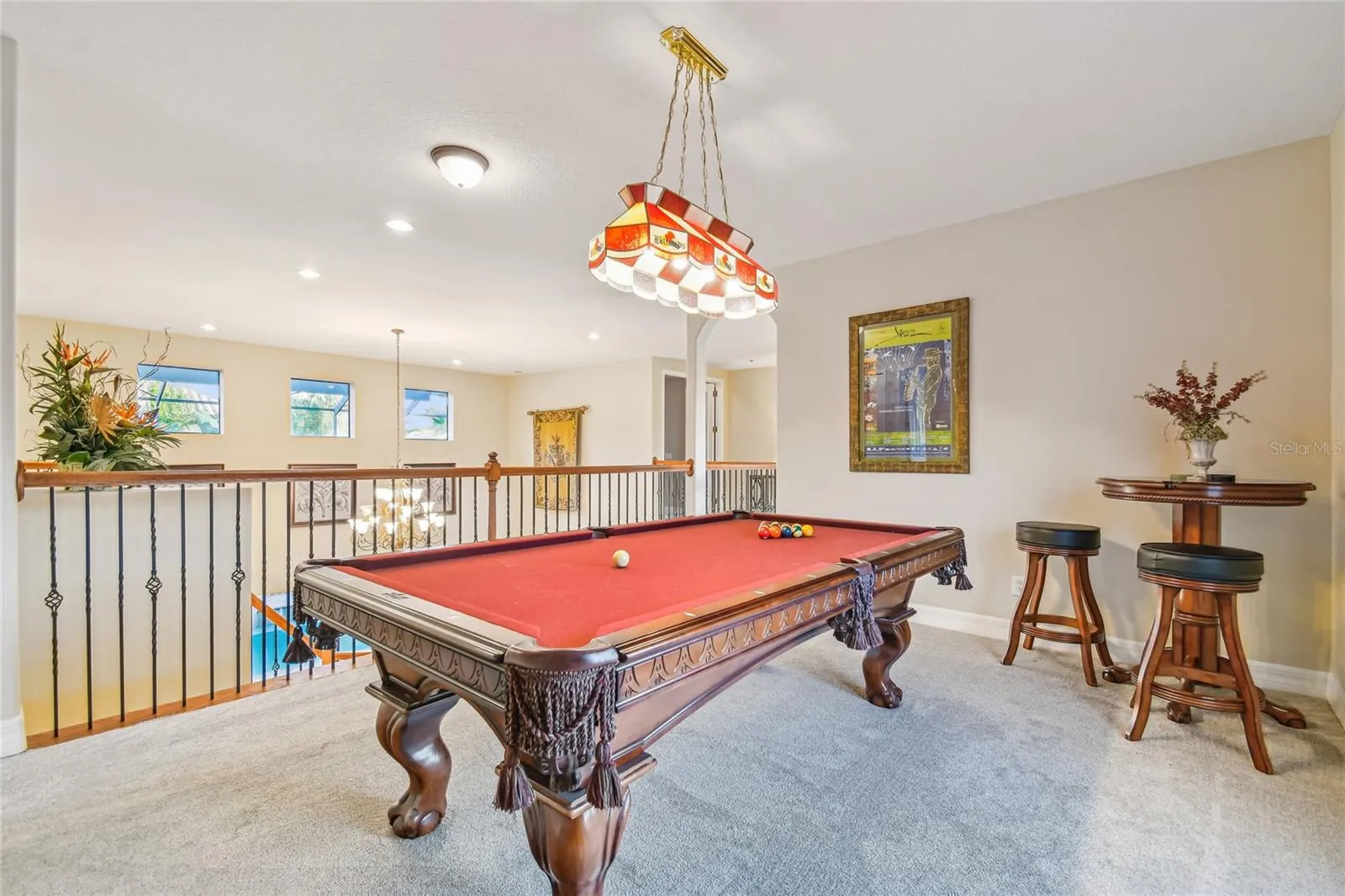Upstairs are four additional bedrooms, 2 full bathrooms combining tub and shower, and a generous loft, large enough for a pool table that provides flexible living/recreation options. Up here you will also find a media/family room that opens to a private balcony with tranquil views of the pool and wooded backdrop.