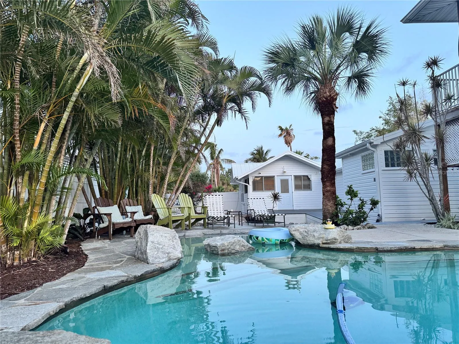 Completely reimagined 1920s historic bungalow, originally the Longboat Key Post Office, located just two blocks from Whitney Beach and one block from Sarasota Bay and public boat ramp access. This charming single-story residence is a meticulous rebuild with an open-concept great room featuring high ceilings, abundant natural light, and a gourmet kitchen equipped with stainless steel appliances and a gas range. The private, fully fenced backyard offers a heated swimming pool, separate hot tub, lush tropical landscaping, and the soothing sound of swaying palms.