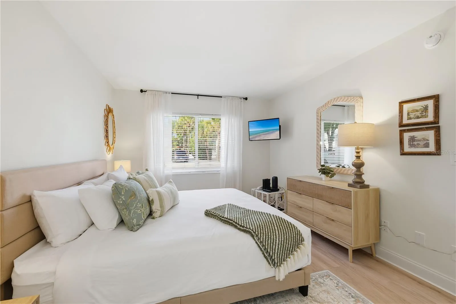 Just steps from the powder soft sands of Anna Maria Island, this ground-floor condo in the Nautilus community blends laid-back coastal living with fresh, thoughtful design throughout. The open floor plan creates a natural flow from the sleek, modern kitchen to the sunlit dining and living areas, making the most of every inch of space. Crisp white cabinetry, stone countertops, and stainless steel appliances set the tone for easy elegance, while wide windows and sliding glass doors invite in the Florida sunshine and lead to your private patio retreat. The serene bedrooms offer calming palettes and soft textures, while both bathrooms have been beautifully refreshed with clean, contemporary finishes. Residents enjoy access to a heated pool, tennis and pickleball courts, and beautifully maintained grounds, along with pet-friendly policies and the flexibility of weekly rentals. With charming shops, local dining, and the Gulf just beyond your doorstep, this is island living at its most effortless.