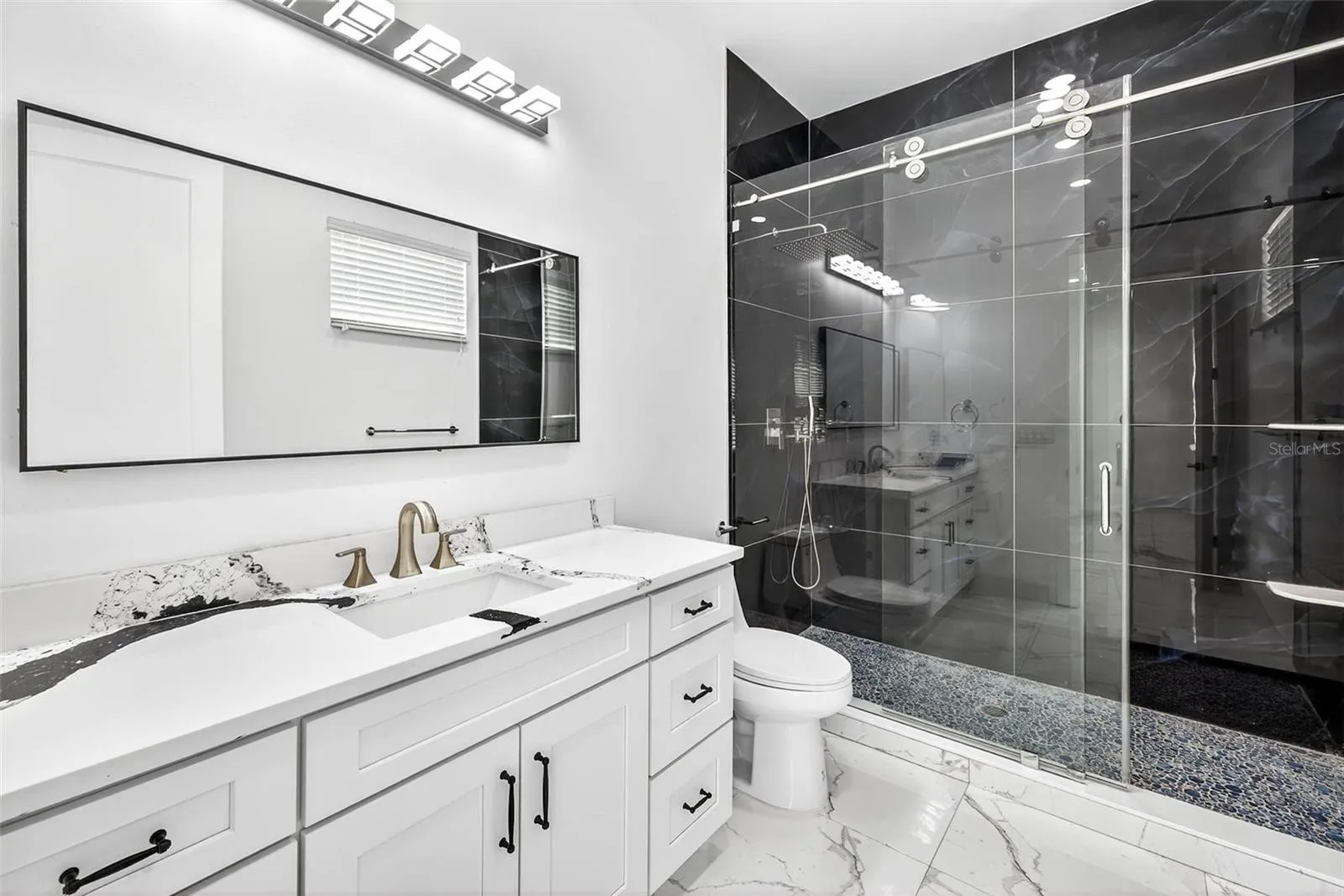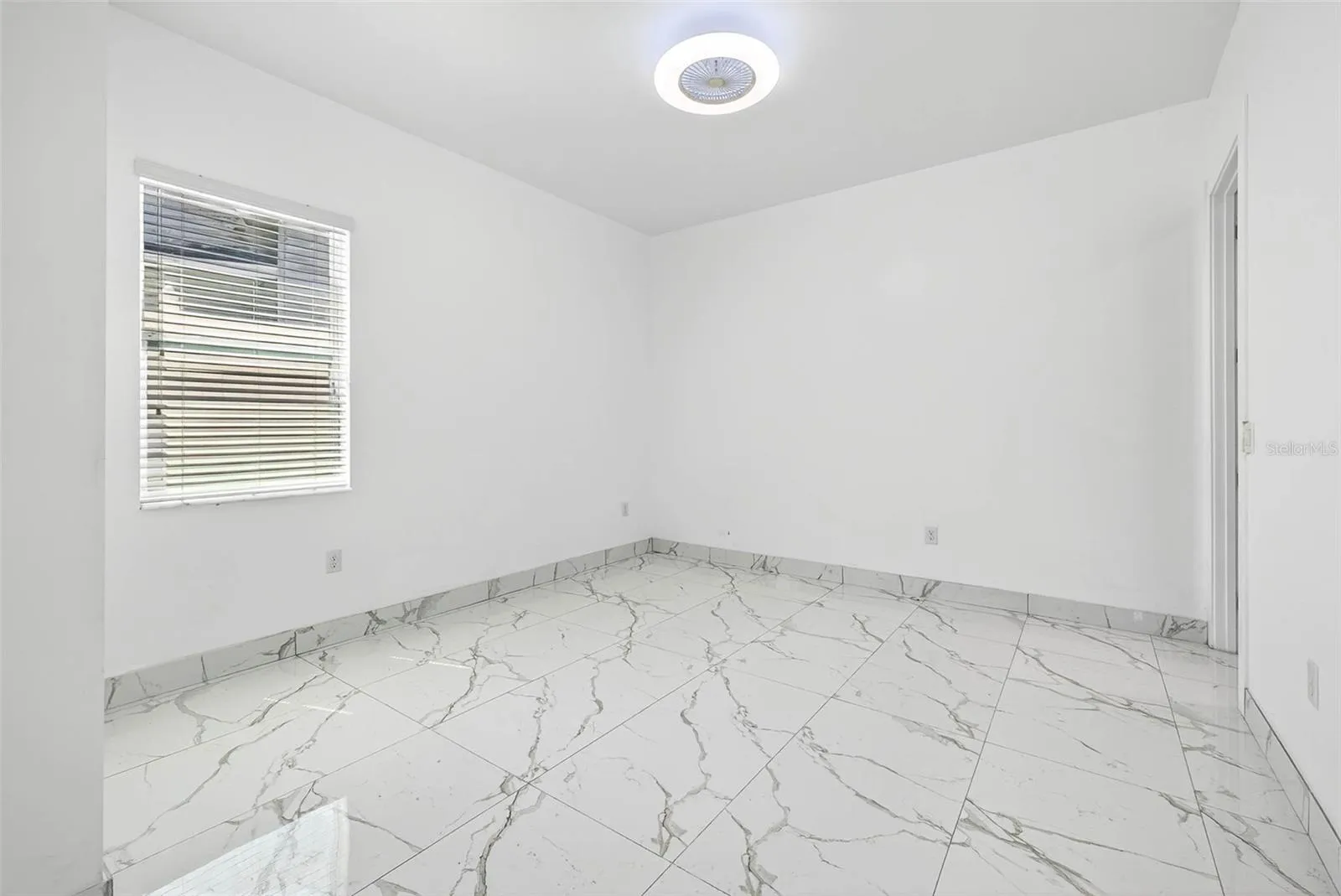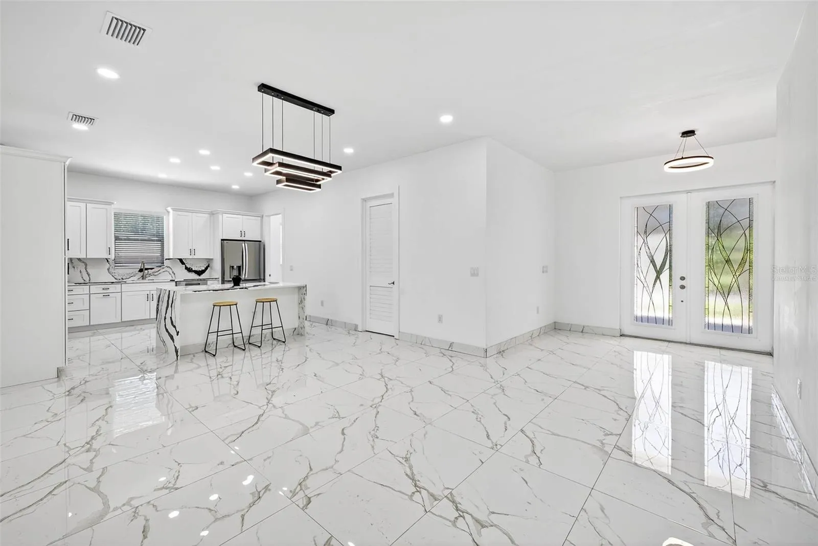 The modern kitchen is the centerpiece of the home, featuring a striking waterfall island, marble-look countertops with bold veining, stainless steel appliances, and extensive cabinetry. A large storage room off the kitchen can also function as a walk-in pantry. The kitchen flows seamlessly into the dining area and the spacious living room, complete with dual sliding doors that open to a covered patio and a large fenced backyard—perfect for relaxing or entertaining. A conveniently located half bath serves the main living spaces.