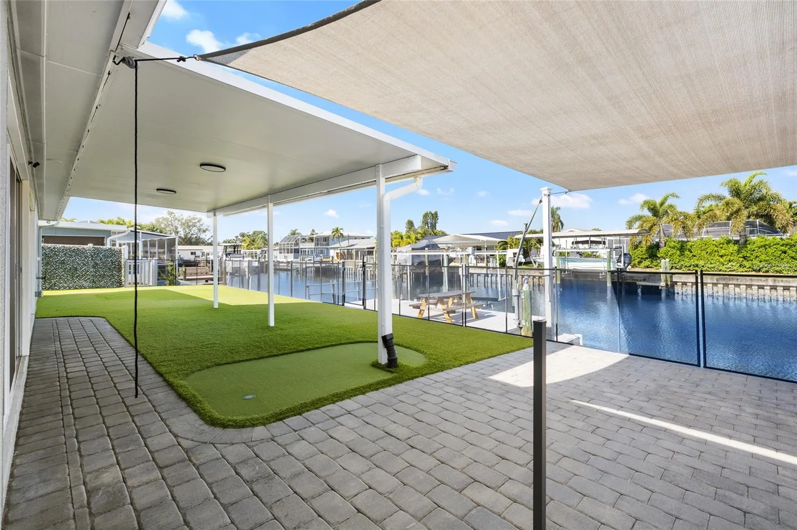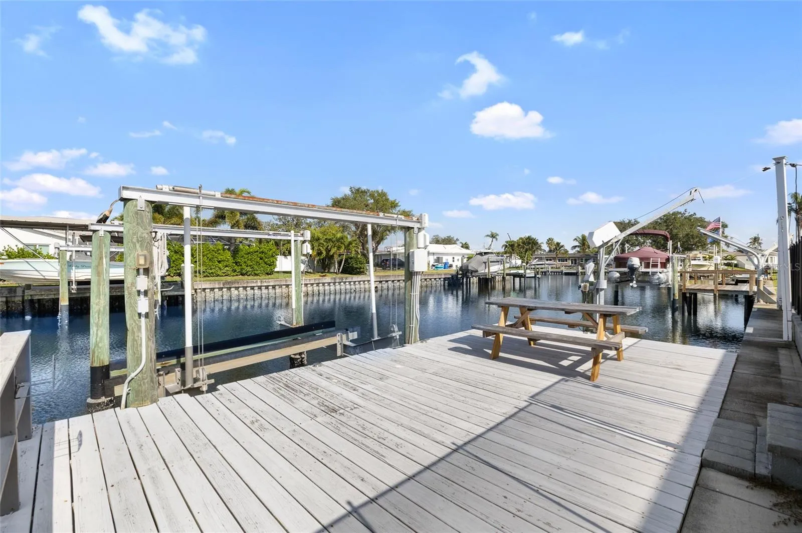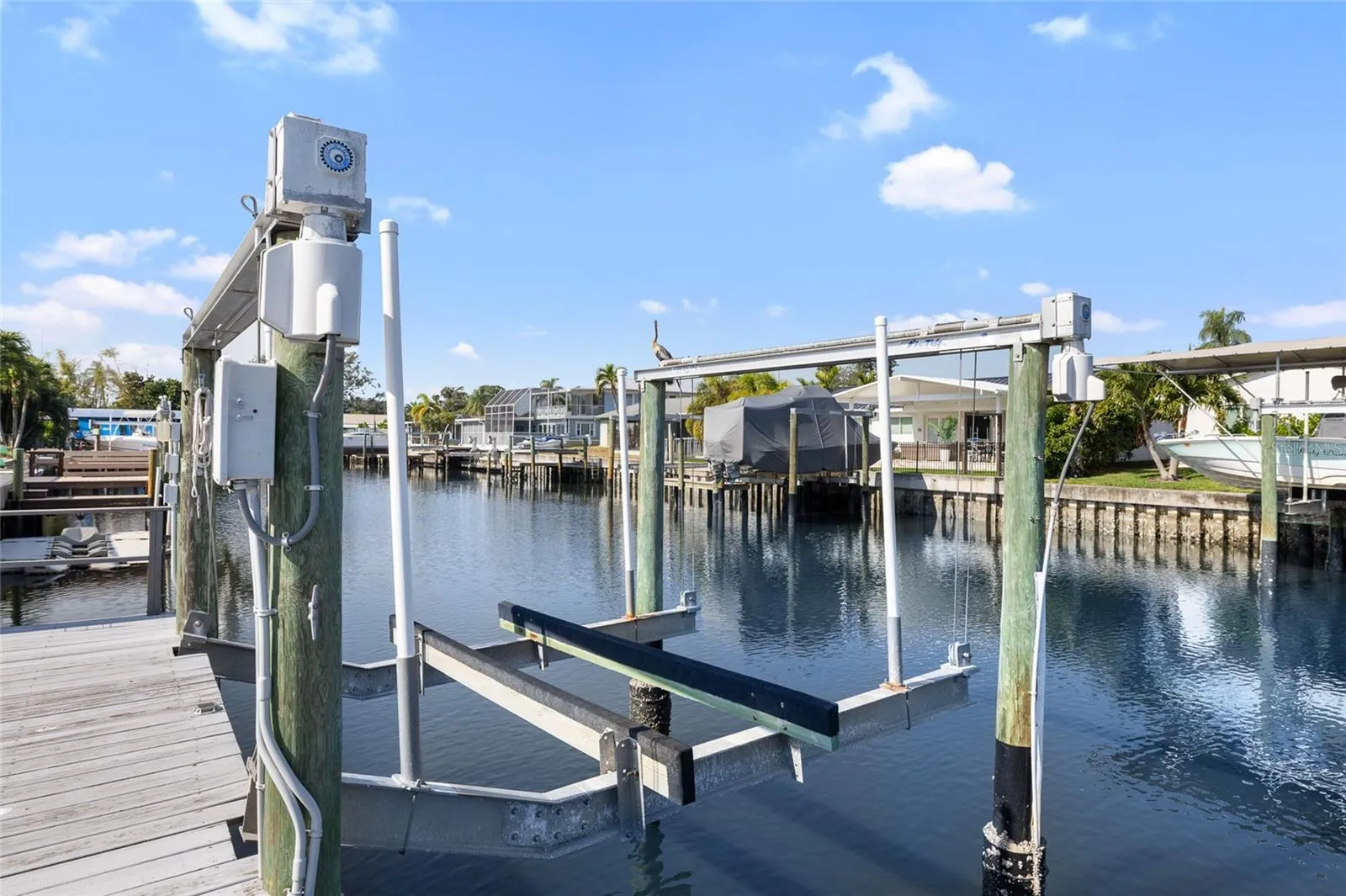 The backyard feels like a private retreat, complete with a hot tub/swim spa, zero-scaped landscaping, premium turf, and pavered outdoor living areas. A new vinyl privacy fence surrounds the space, while the reinforced seawall (estimated 10–15 years old with concrete pilings) and private dock with upgraded boat-lift cables provide long-term stability and convenience. The lift can accommodate boats up to 10,000 lbs or approximately 25–27 feet.