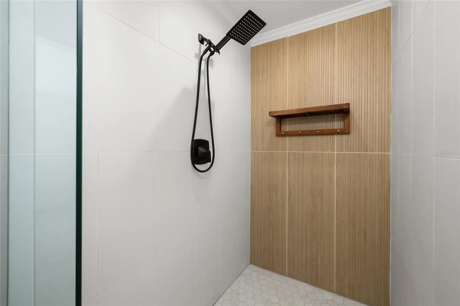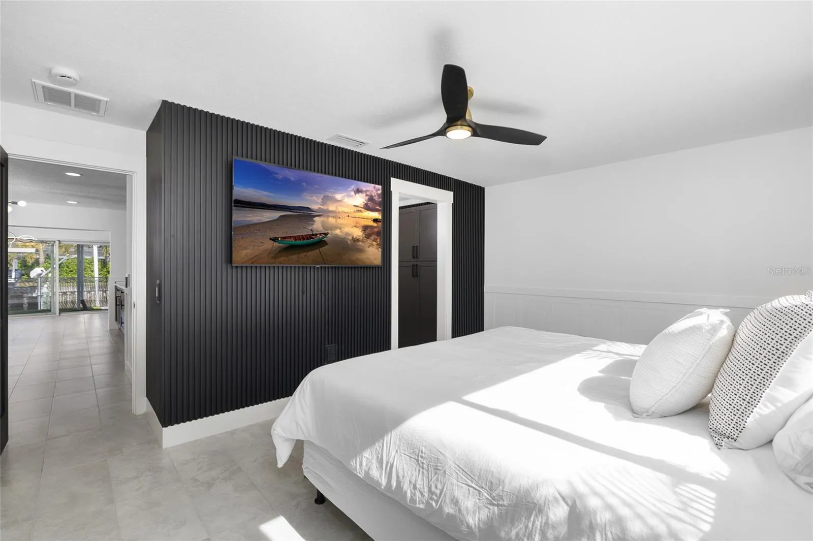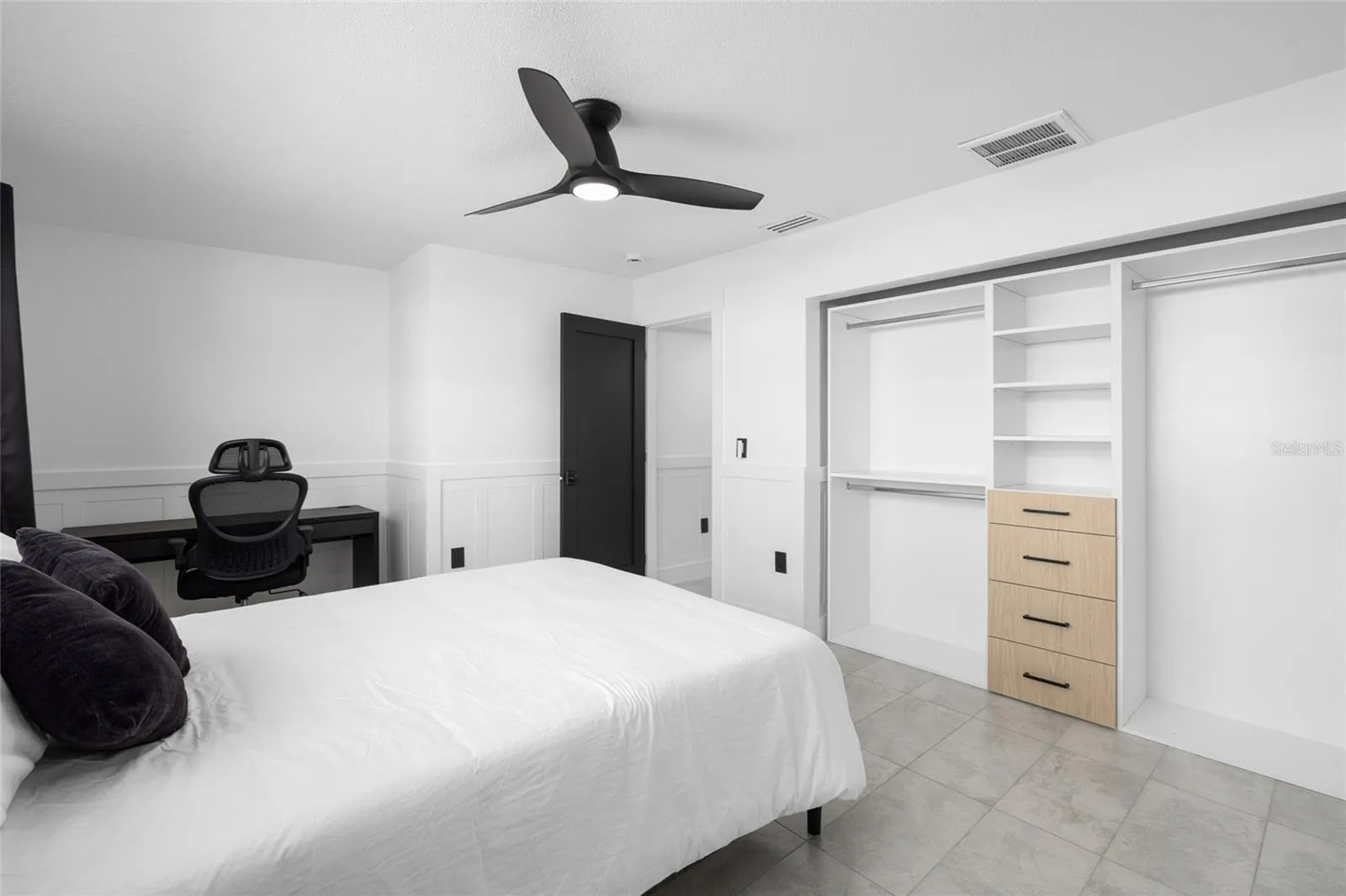 Inside, an open and sunlit floor plan features custom wood accent walls, upgraded solid-core doors, built-in closet systems, and designer lighting throughout. The kitchen is outfitted with custom cabinetry, quartz countertops, and new GE Café appliances, while both bathrooms include Moen fixtures, custom glass enclosures, and quality finishes. Major improvements—roof (2022), HVAC (2022), and new tankless water heater—ensure peace of mind.