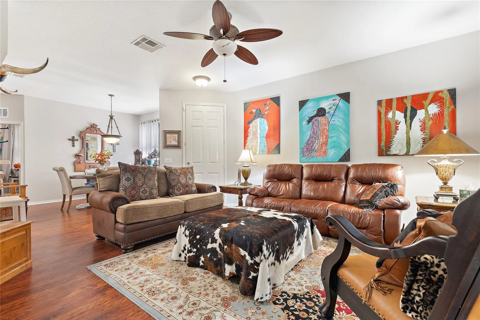 - Ceiling Fans(s), Crown Molding, Open Floorplan, Thermostat, Walk-In Closet(s), Living Room/Dining Room Combo, Primary Bedroom Main Floor, Solid Wood Cabinets, Solid Surface Counters, Cathedral Ceiling(s), Tray Ceiling(s)