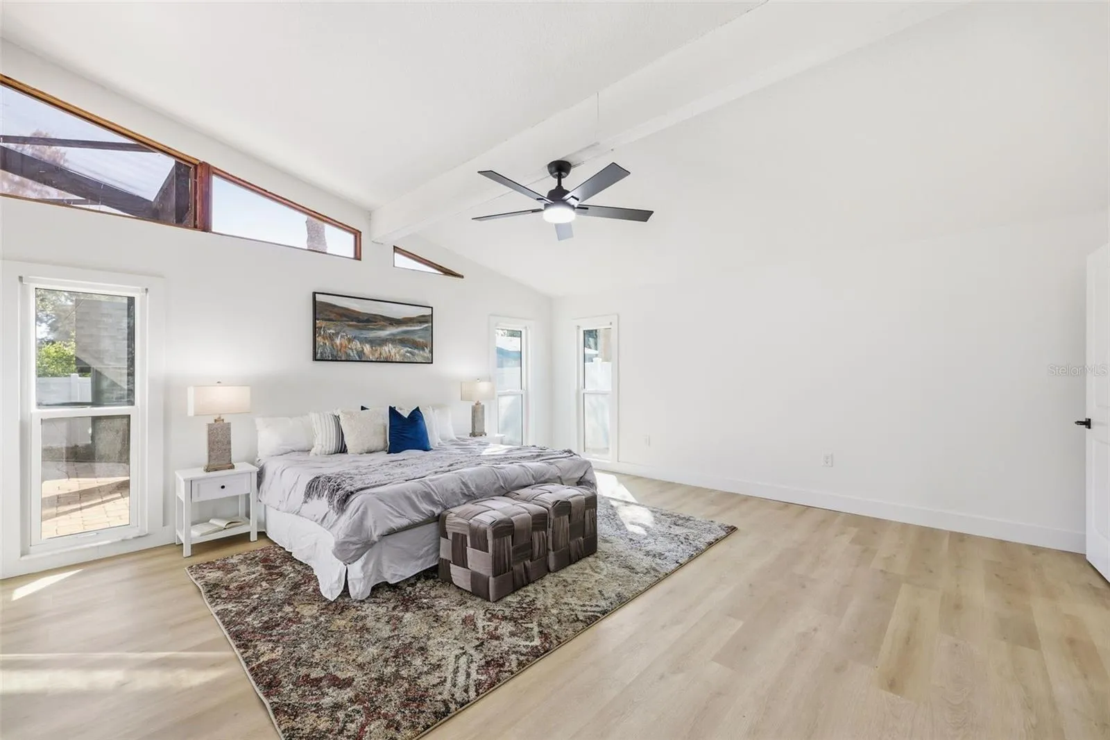 Step inside to soaring ceilings with exposed beams, a showpiece stone fireplace, and an open-concept living space filled with natural light. The gourmet kitchen and bathrooms are completely updated with contemporary finishes, sleek fixtures, and high-design details. The oversized primary suite features vaulted ceilings, large windows, and direct access to the pool area.
