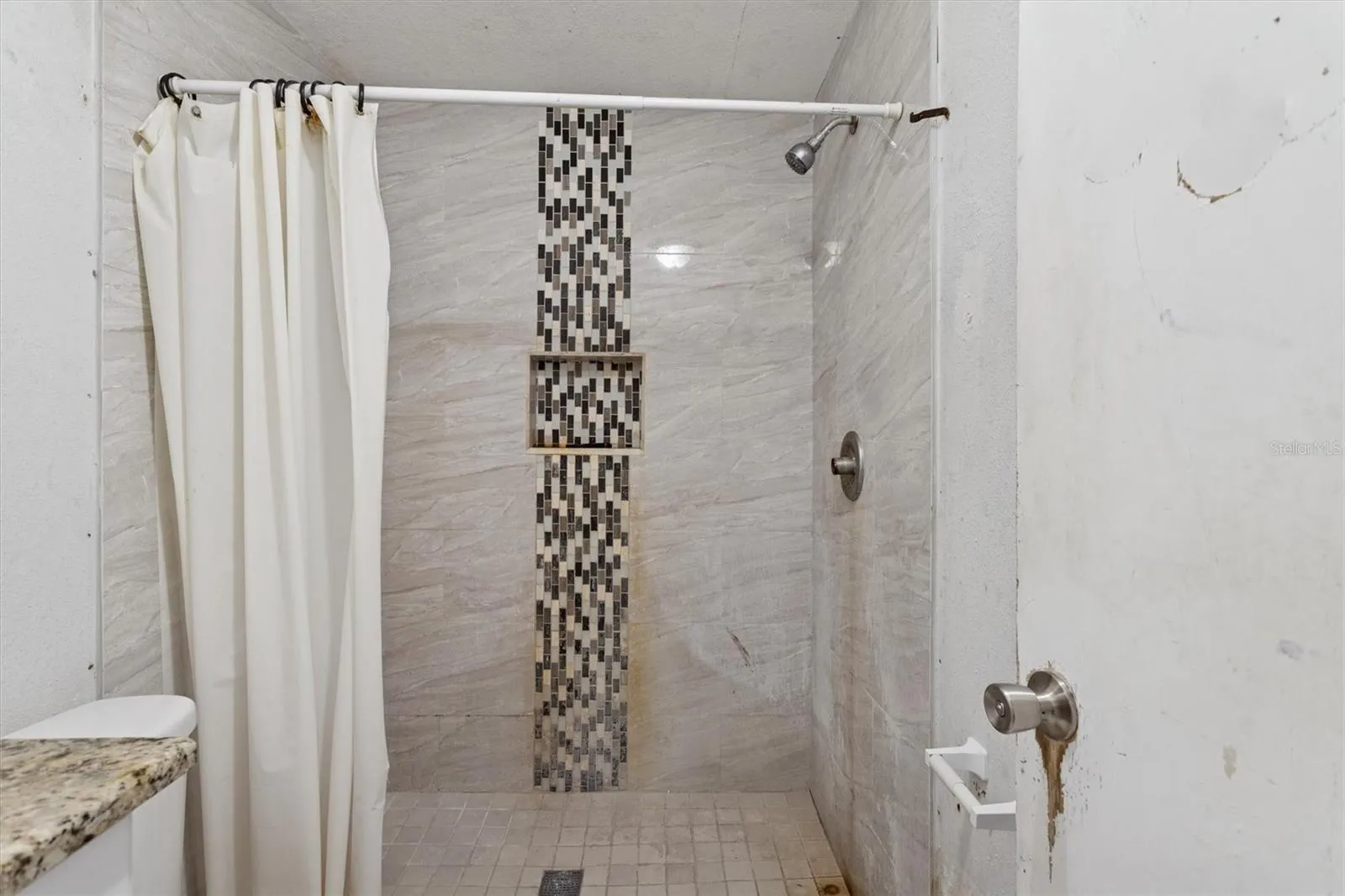 Inside, the kitchen features white cabinetry with sleek modern hardware, and granite countertops. Tile flooring runs throughout for easy maintenance, and the open, light-filled living areas are enhanced by ceiling fans and a functional layout. One bathroom has been luxuriously renovated with a tiled walk-in shower, mosaic accent, built-in niche, and contemporary vanity with stone top and vessel sink. The second bathroom is well-maintained and ready for light cosmetic upgrades, offering an easy value-add opportunity