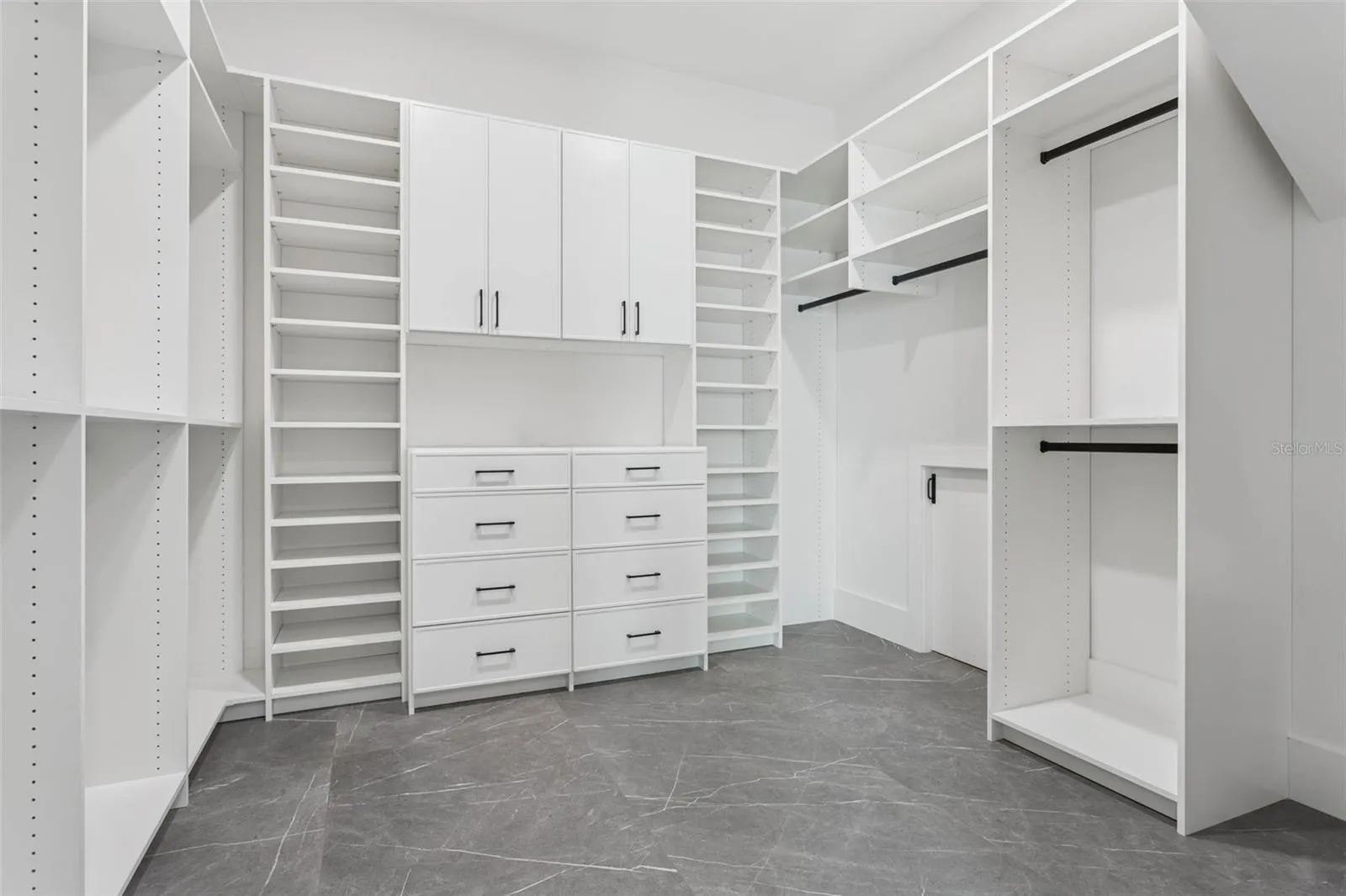 The first-floor primary suite is a tranquil retreat featuring private lanai access, a tray ceiling, and a generous walk-in closet with a cosmetic vanity and a built-in laundry pass-through. The spa-inspired bathroom showcases a frameless glass shower, freestanding soaking tub, and dual vanities designed with both elegance and functionality in mind.