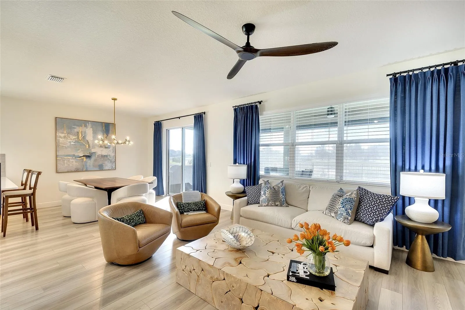 - Ceiling Fans(s), Crown Molding, Open Floorplan, Walk-In Closet(s), Eat-in Kitchen, Kitchen/Family Room Combo, Window Treatments, High Ceilings, Solid Surface Counters, PrimaryBedroom Upstairs