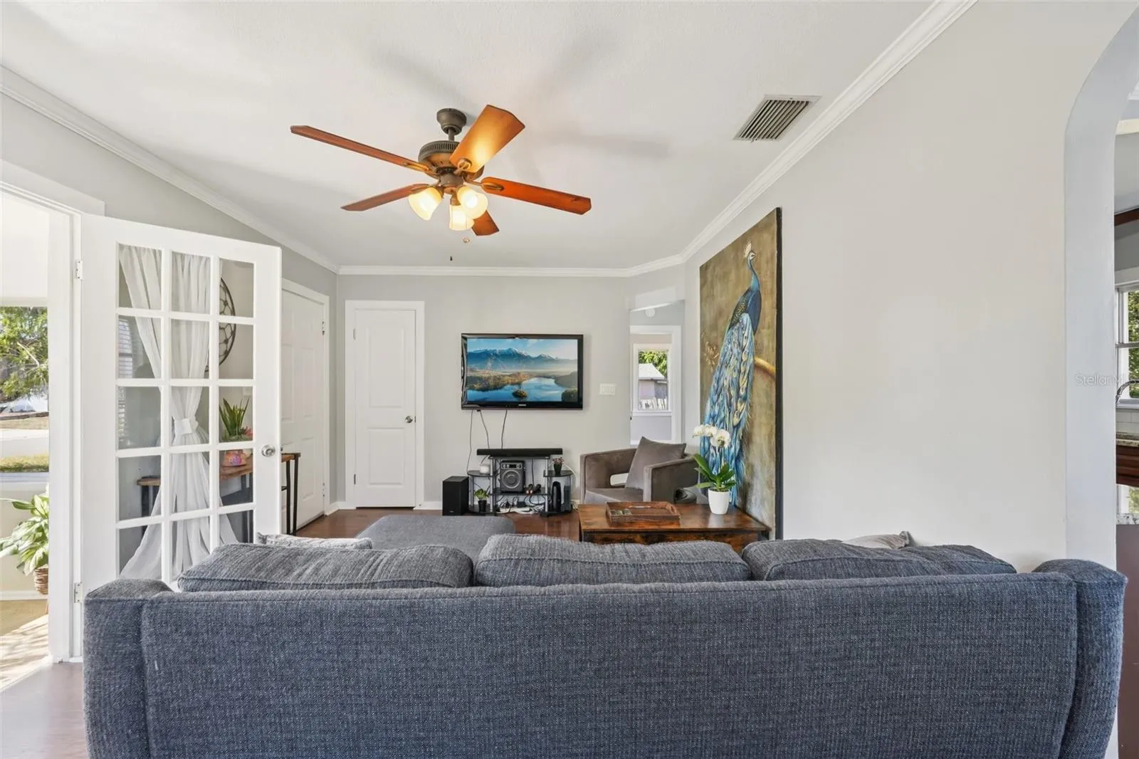 Welcome to this charming and well maintained mid-century home located in a desirable St. Petersburg neighborhood. This 2 bedroom 1 bathroom home features a spacious living room with French doors that open to a Florida Room, perfect for a home office, playroom, or additional lounge space. The kitchen offers solid wood cabinetry, granite countertops, and stainless steel appliances, along with a dedicated dining area just off the kitchen. The bathroom includes tasteful tile work, a modern vanity, and updated fixtures. Wood laminate flooring flows throughout most of the home, complemented by crown molding, ceiling fans, and quality finishes throughout. A detached one-car garage includes electrical service and washer and dryer setup. The large backyard offers patio space, alley access, and plenty of room to enjoy outdoor living. Located outside of a flood zone and just minutes from the newly renovated Publix shopping plaza, Bay Pines VA Medical Center, and Madeira Beach, this move-in-ready home offers comfort, character, and convenience.