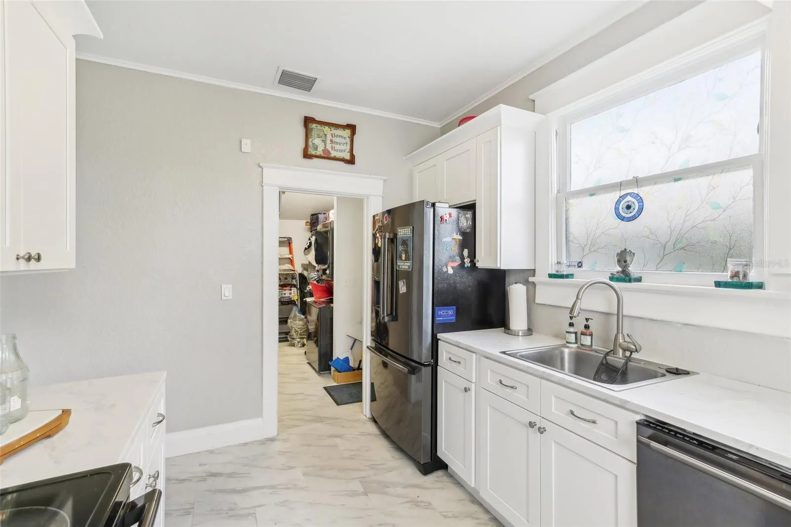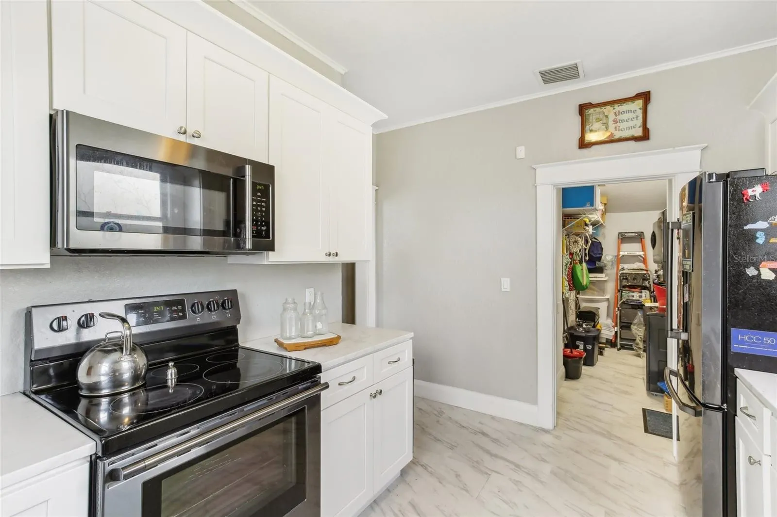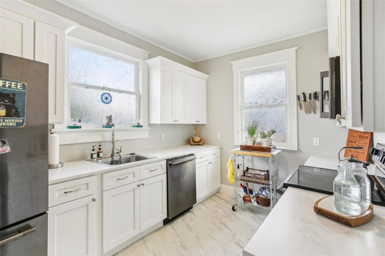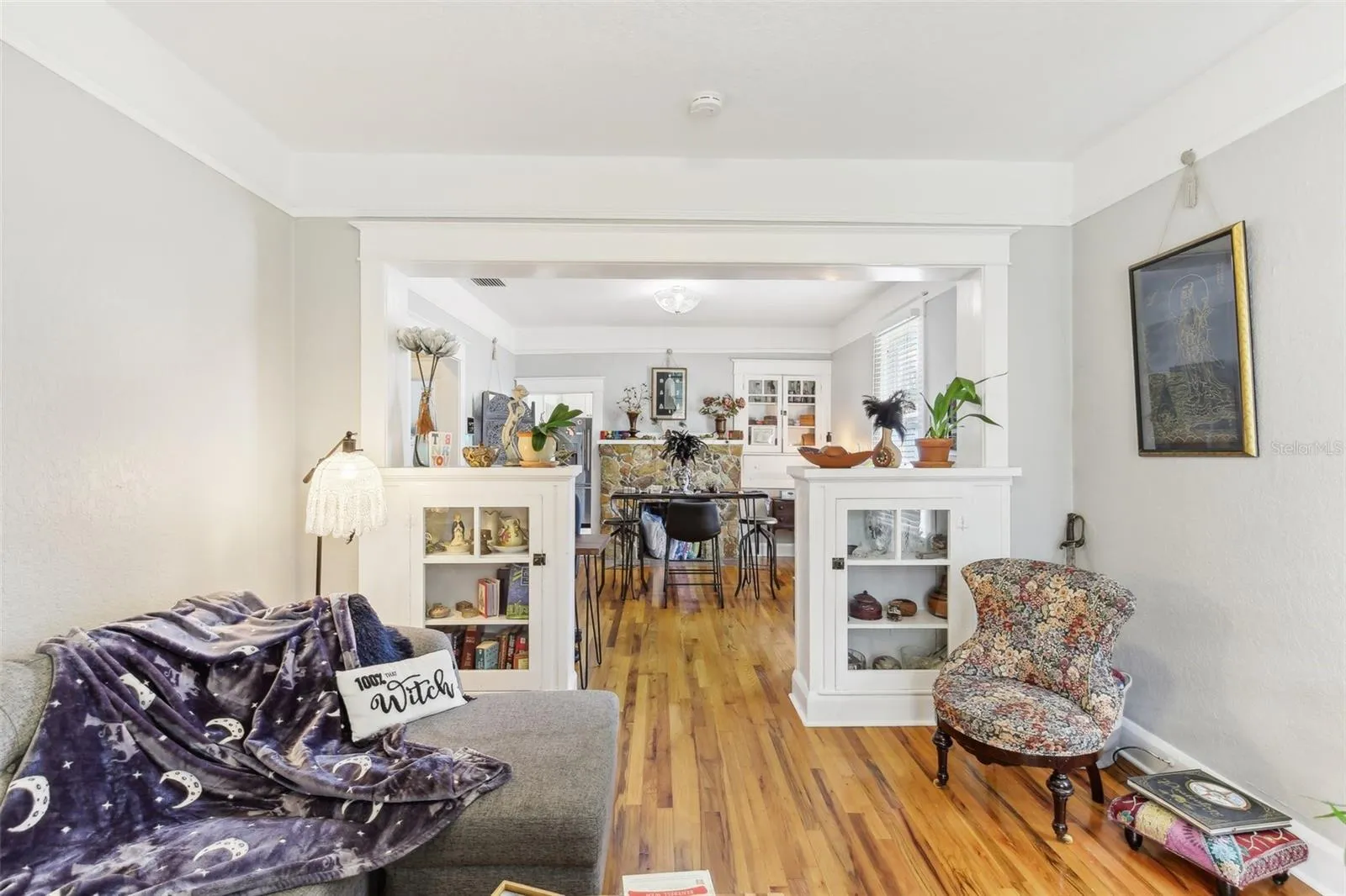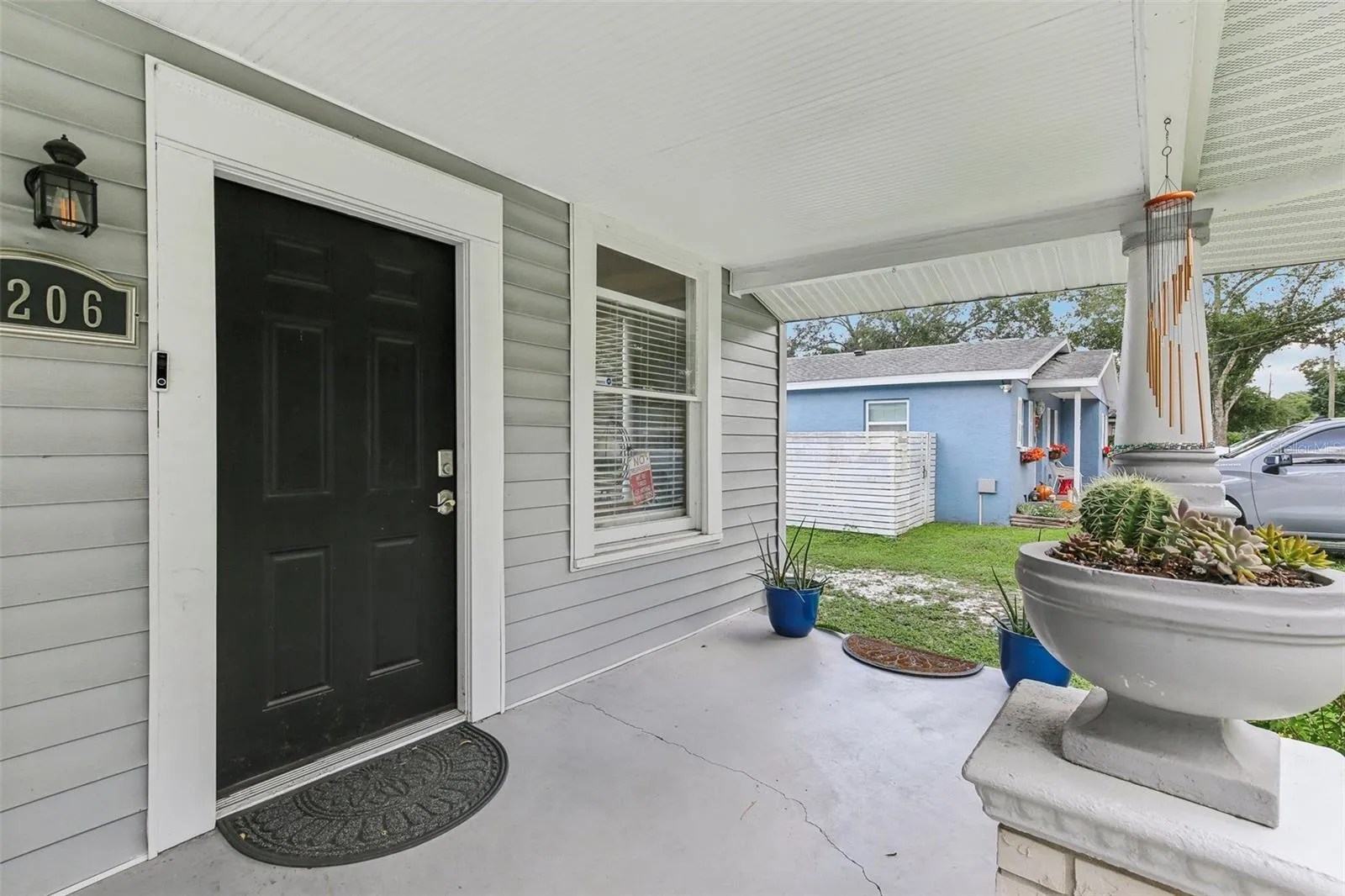 Discover this beautifully remodeled 1928 bungalow in the highly desirable Seminole Heights neighborhood. Enjoy a modern kitchen featuring crown molding, durable vinyl laminate flooring, and a new laundry room. The living room, dining room, and hallway boast elegant hardwood floors, complemented by charming original cabinetry. The bathroom has also been updated for your convenience. Step onto the spacious front porch, perfect for relaxing and chatting with neighbors. Freshly painted inside and out, this home includes a new A/C (2021), water heater (2021) and new roof on home and garage (2025). The expansive backyard is ideal for your furry friend or entertaining guests, and there’s a one-car garage with a large planter bed next to it—perfect for a vegetable garden! Just a short walk away, Giddens Park offers a fully equipped playground with a splash pad, interactive fountain, sports courts, and ample green space. Enjoy quick freeway access and proximity to attractions like Lowry Park Zoo, Busch Gardens, Adventure Island, and the Channelside District. All room sizes are approximate; buyer to verify for accuracy.