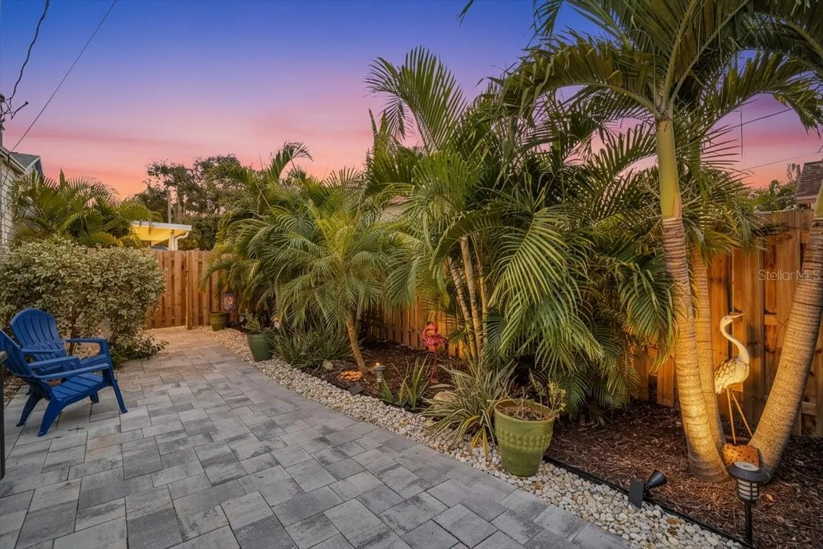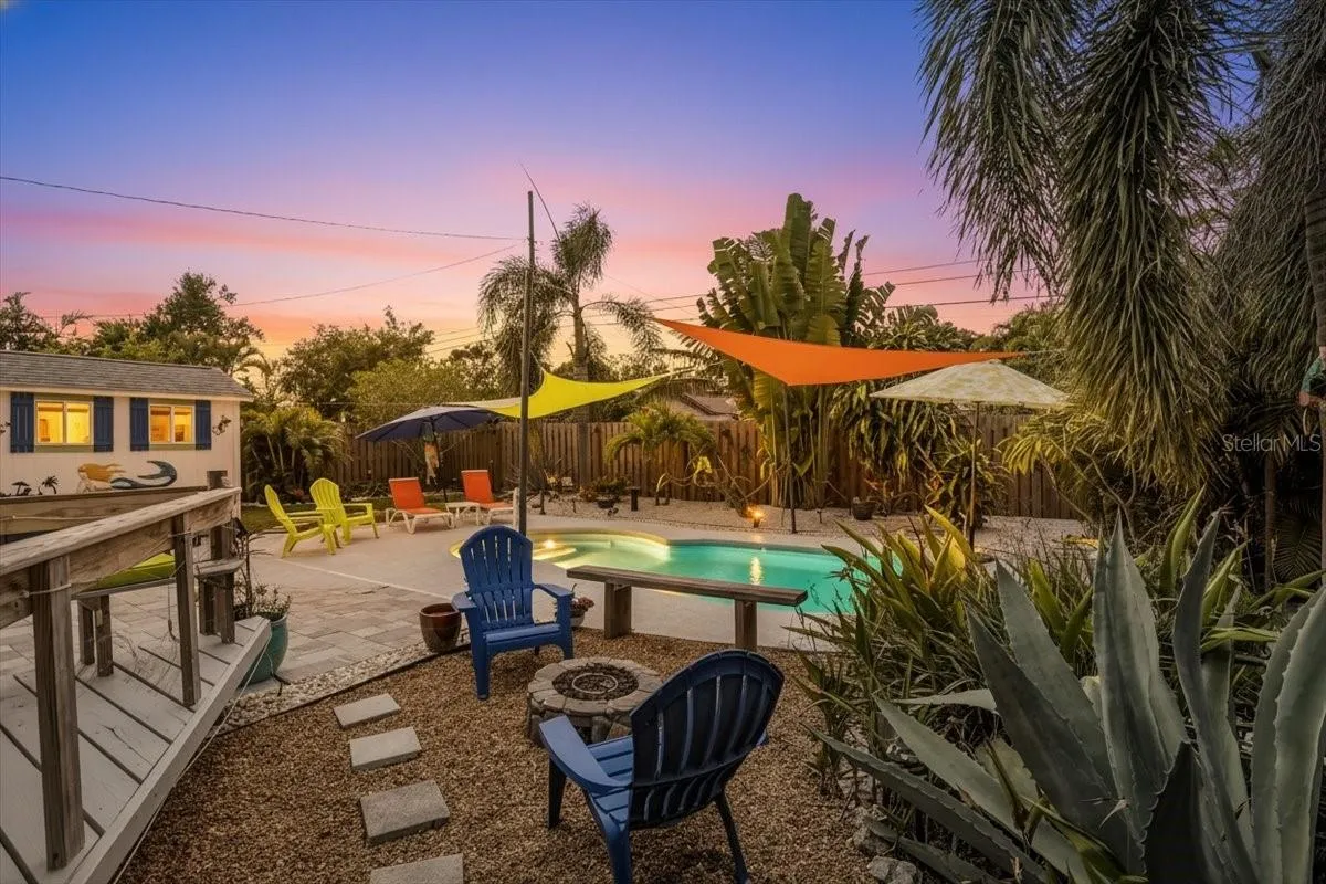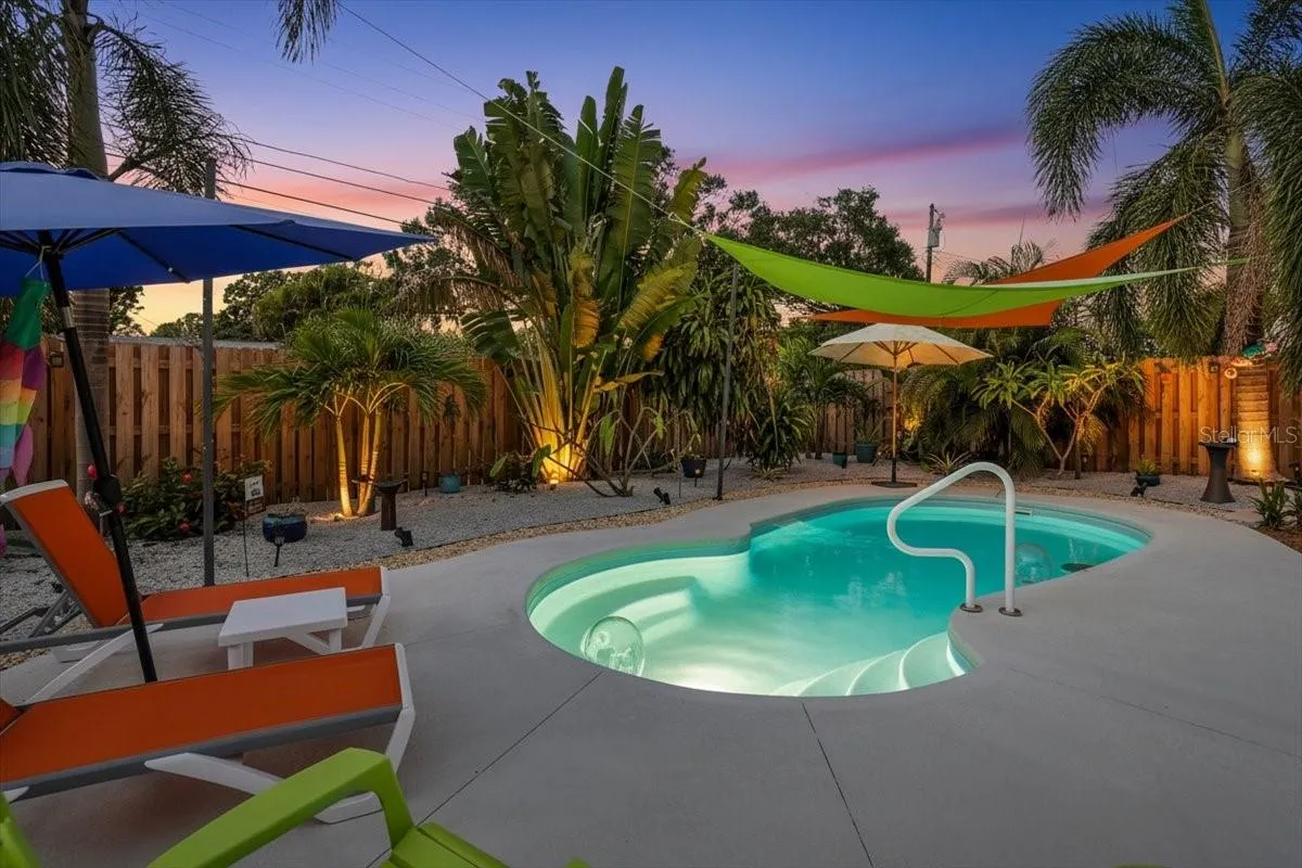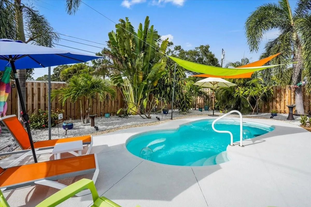 Your Gulfport POOL home paradise awaits! Step into your perfect Florida lifestyle with this stunning, updated home in highly sought-after and beachy Gulfport. Every detail has been meticulously cared for in this three bedroom, two bathroom. The open floor plan is perfect for hosting and daily living. The living area is light filled and opens to the large chef’s kitchen featuring white shaker cabinets and tons of quartz counter space. Master suite is generously sized and has an attached bath with dual sinks, and large glass shower, plus a huge walk-in closet. The two other bedrooms share an updated hall bath. Out back, relax on your deck with retractable awning overlooking the pavered pool area with tropical landscaping and a cool tiki bar. Pool is saltwater and is brand new and surrounded by cool deck coating! Other updates include: New HVAC 2024, new shadowbox wood fence & new roof 2025, pavered driveway and patio, tankless water heater, large 10×8 Tuff shed, electric vehicle charger. Attached carport keeps all your toys safe from our sunny weather. NO FLOOD INSURANCE REQUIRED. Alley access. 1.5 blocks to the Pinellas Trail. Close to DTSP, our best Gulf Beaches and 2 International Airports. Call to start enjoying Paradise today! Room sizes are approximate and should be verified. All information is deemed to be accurate but is not warranted.