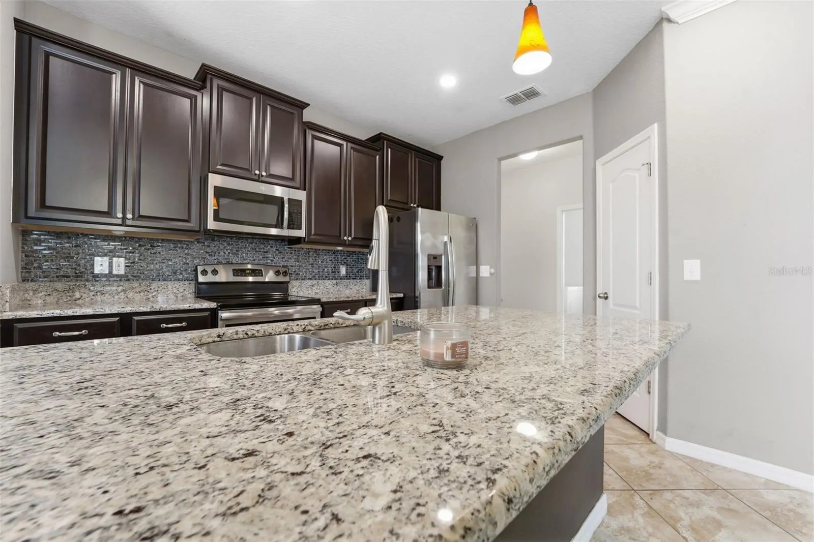 Discover a stunning 3-bedroom, 3-bath home tucked inside the beautifully maintained, gated Villages at Trinity Lakes. This thoughtfully crafted two-story layout brings comfort, convenience, and style together in the best possible way. The main level features an inviting open kitchen with an oversized island that flows effortlessly into the dining and living areas—perfect for everyday living or entertaining a crowd. Just beyond the sliding doors, your private outdoor oasis awaits. A covered patio overlooks a heated, variable-speed spa and sparkling pool equipped with an energy-efficient heat pump—your own personal retreat for relaxing weekends or memorable gatherings.