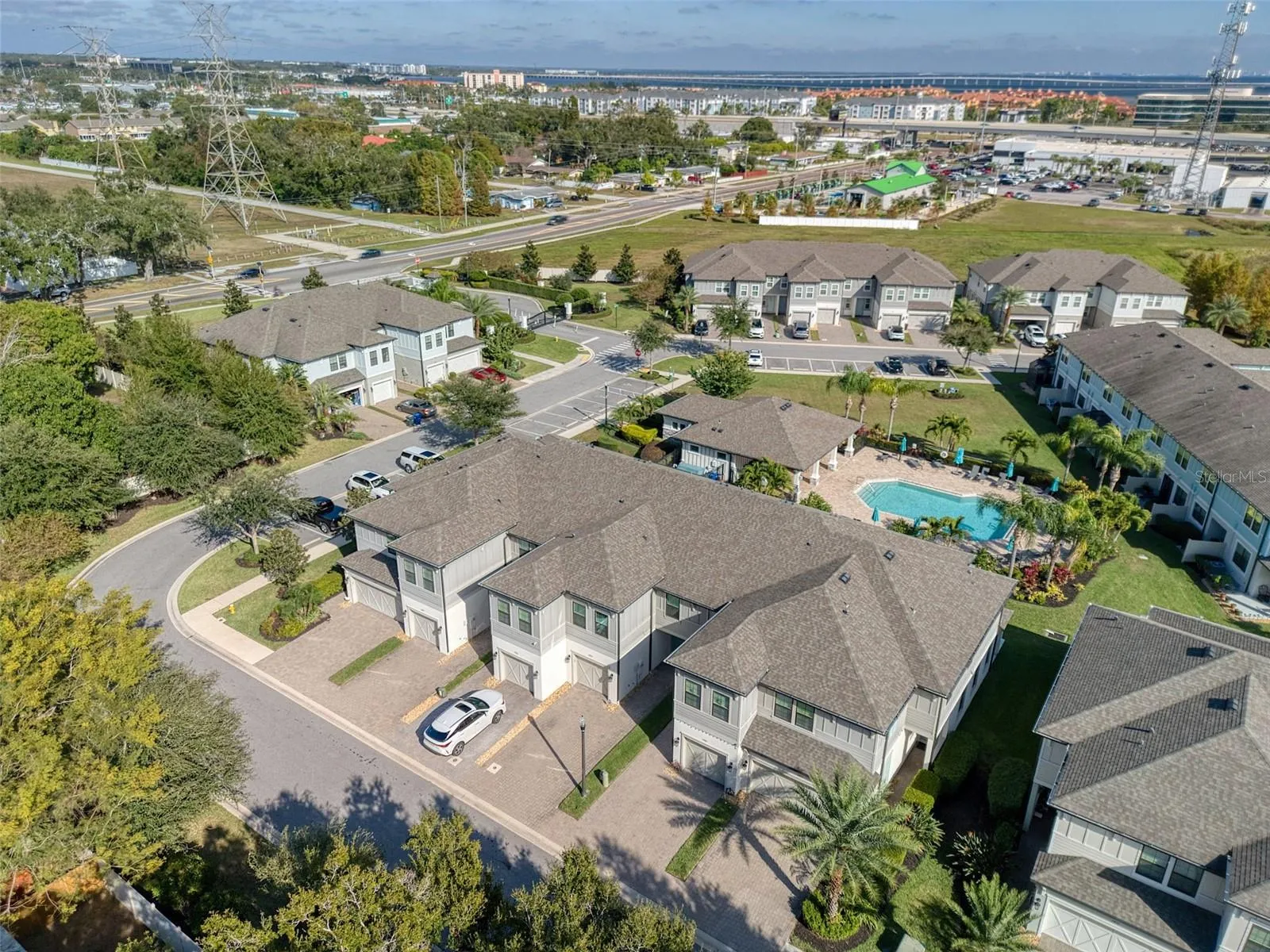 Welcome to the best of townhome living in this pristine coastal vibe 1571 sq ft townhome, NOT in a flood zone, with the BEST view in the neighborhood of the well kept grounds and swimming pool. No rear neighbors!!! Bright and beautifully chic aptly describes this pristine 2 bedroom, 2.5 bath with a loft townhome in the popular Towns of Belleair Grove neighborhood. This elegant home features plenty of natural light and room to grow in this well laid out floor plan, featuring 2 generous bedrooms, 2.5 bathrooms, a dining area that can seat 8, a spacious living room, a light and bright loft, and a spacious modern kitchen. The kitchen’s clean lines showcases pristine white quartz countertops complemented by a spacious breakfast bar, sleek white 42″ cabinetry, and stainless steel appliances. The tranquil primary suite is located at the rear of the townhome for privacy and is split from the loft and other bedroom with a view of the pool. With its airy dimensions, 2 built in closets fitted out by CA closets and sumptuous ensuite bath that boasts dual vanities set in quartz, alongside a frameless glass shower ~ creates a peaceful retreat. The home’s second bathroom mirrors this modern aesthetic with its streamlined fixtures and quartz surfaces. Privacy and entertainment seamlessly merge in the home’s outdoor living spaces, featuring a private patio with a view of the pool. The front patio looks out at trees, creating a tranquil setting. This home boasts tasteful touches such as; 6″ white baseboards, high ceilings, LED lighting, high end light fixtures, open floor plan, modern 12″ x 24″ tile floor, luxury vinyl plank on the stairs and loft, and neutral color tones. The 1 car garage has custom overhead storage and with the driveway provides 2 parking spots. There are also additional guest parking spots adjacent to this home. This super cute home does not compromise on comfort or elegance. This delightful home also has energy-efficient dual pane windows and offers ample storage solutions. This home’s location is unparalleled—located close shops, restaurants, beaches and airports. This home’s low maintenance “lock and leave” ability makes it the perfect home for buyers who like to travel or just want worry free living and more time having fun. This home is the quintessential Florida lifestyle home: offering great schools, pristine beaches, and everything delightful Clearwater has to offer.