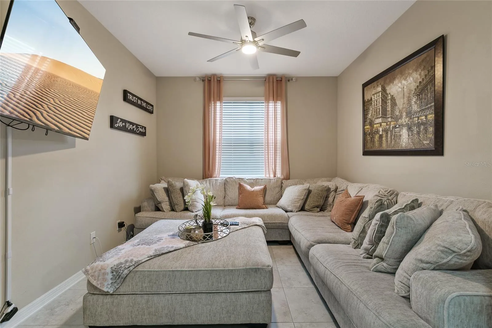 The spacious living room includes a custom entertainment center with a decorative fireplace and built-in 55″ TV stand, creating a warm and modern atmosphere.