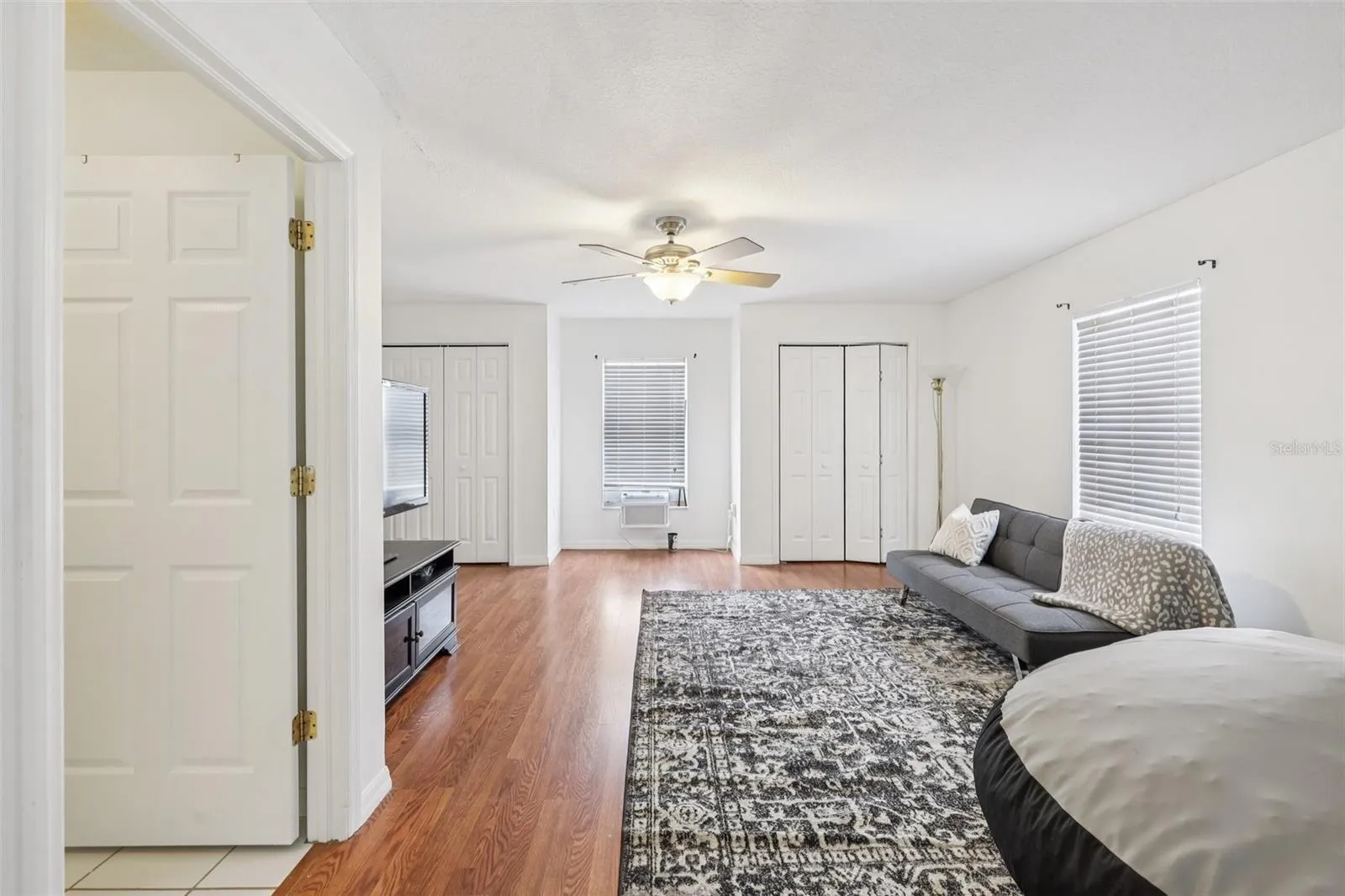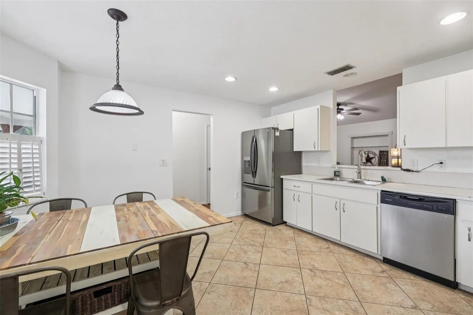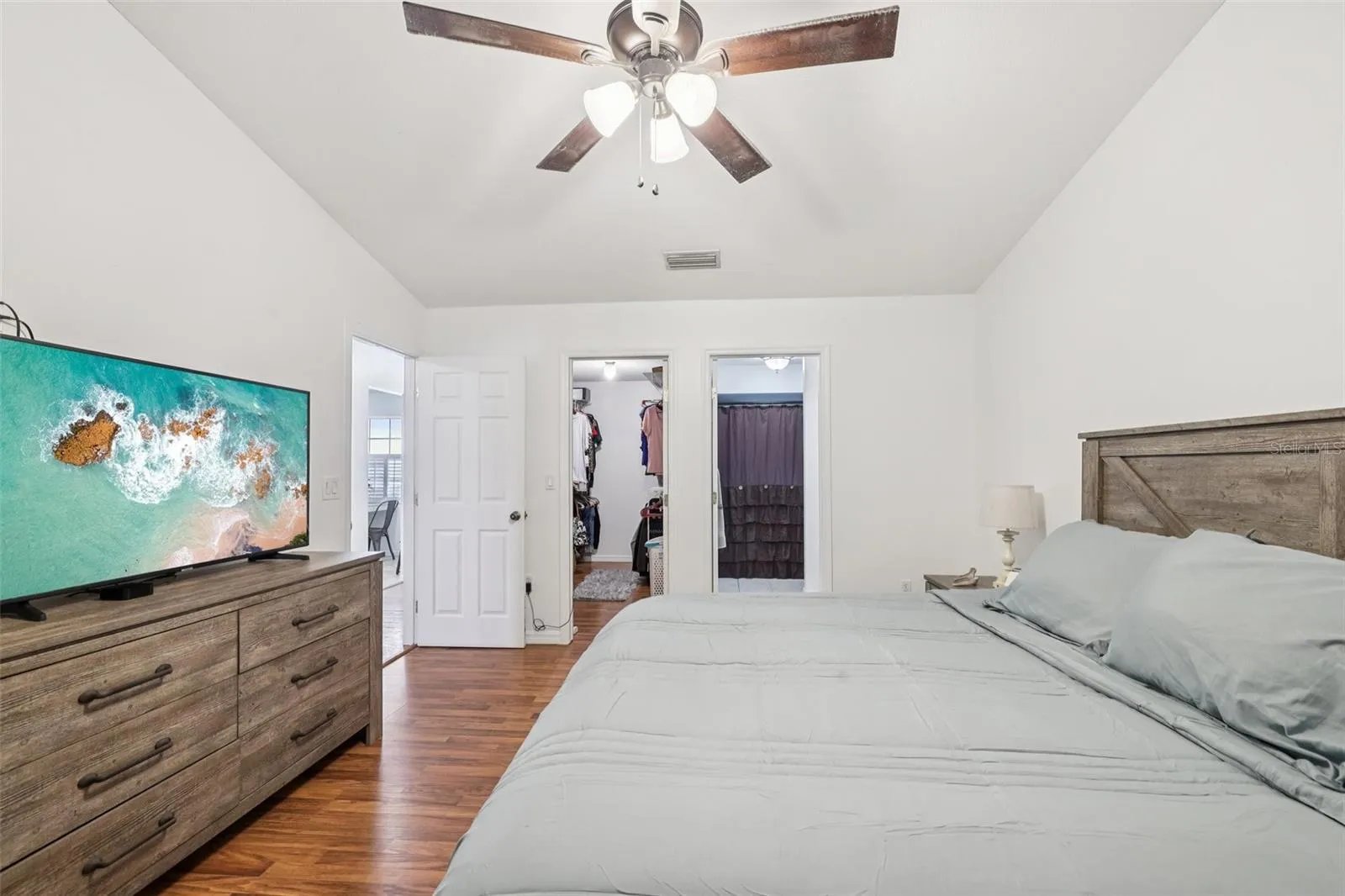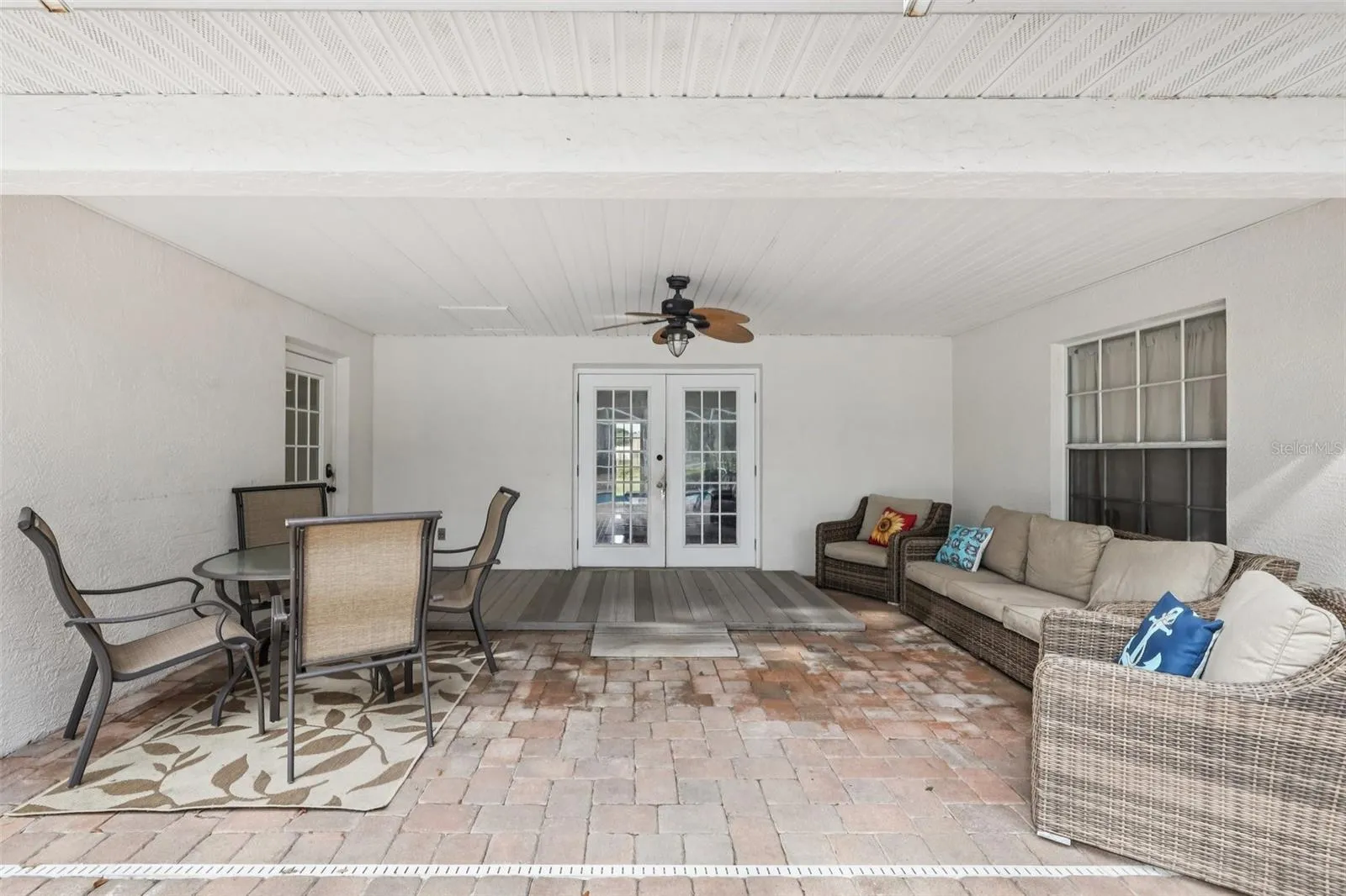 The family room opens through double French doors to a screen-enclosed pool and lanai, creating an easy indoor-outdoor flow. The primary suite offers a spacious walk-in.
