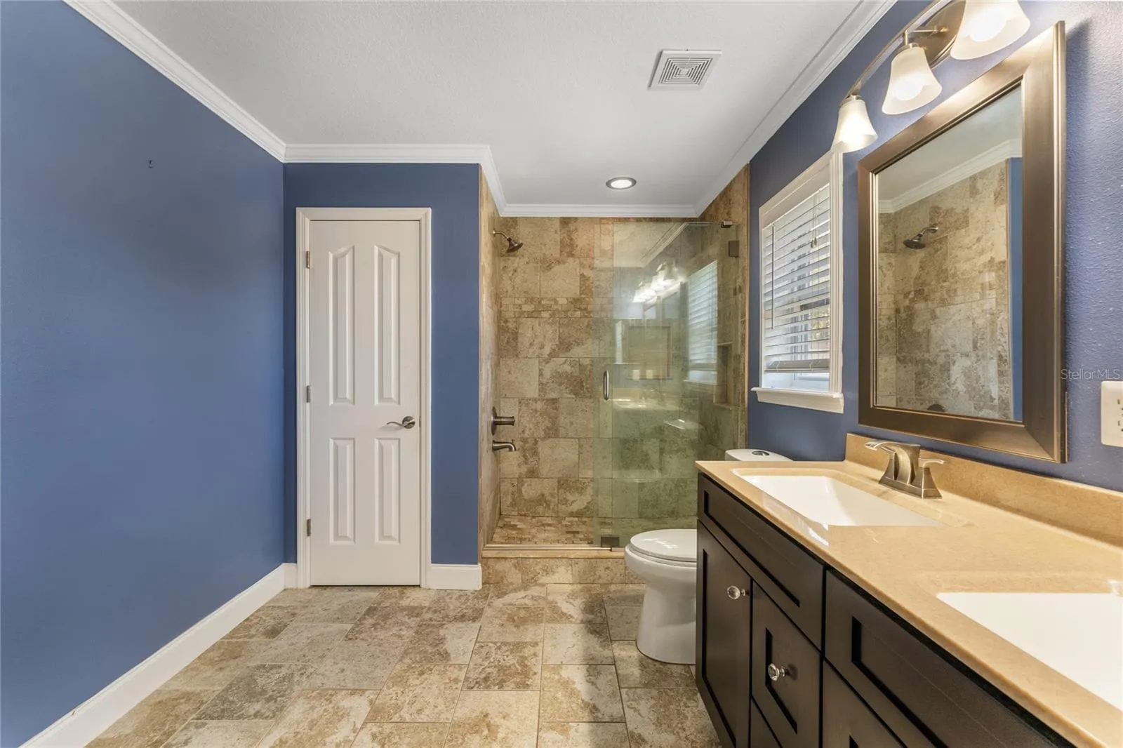 As you step inside this rental home, you’ll be greeted by the tasteful updates throughout. Both full baths have been transformed with new vanities, intricate tile work, stylish mirrors, and ambient lighting. The comfort-height dual flush commodes and elegant glass doors in the master shower add a touch of luxury. The Master walk-in closet features a custom shelving system, designed to accommodate even the most extensive wardrobe collections.
