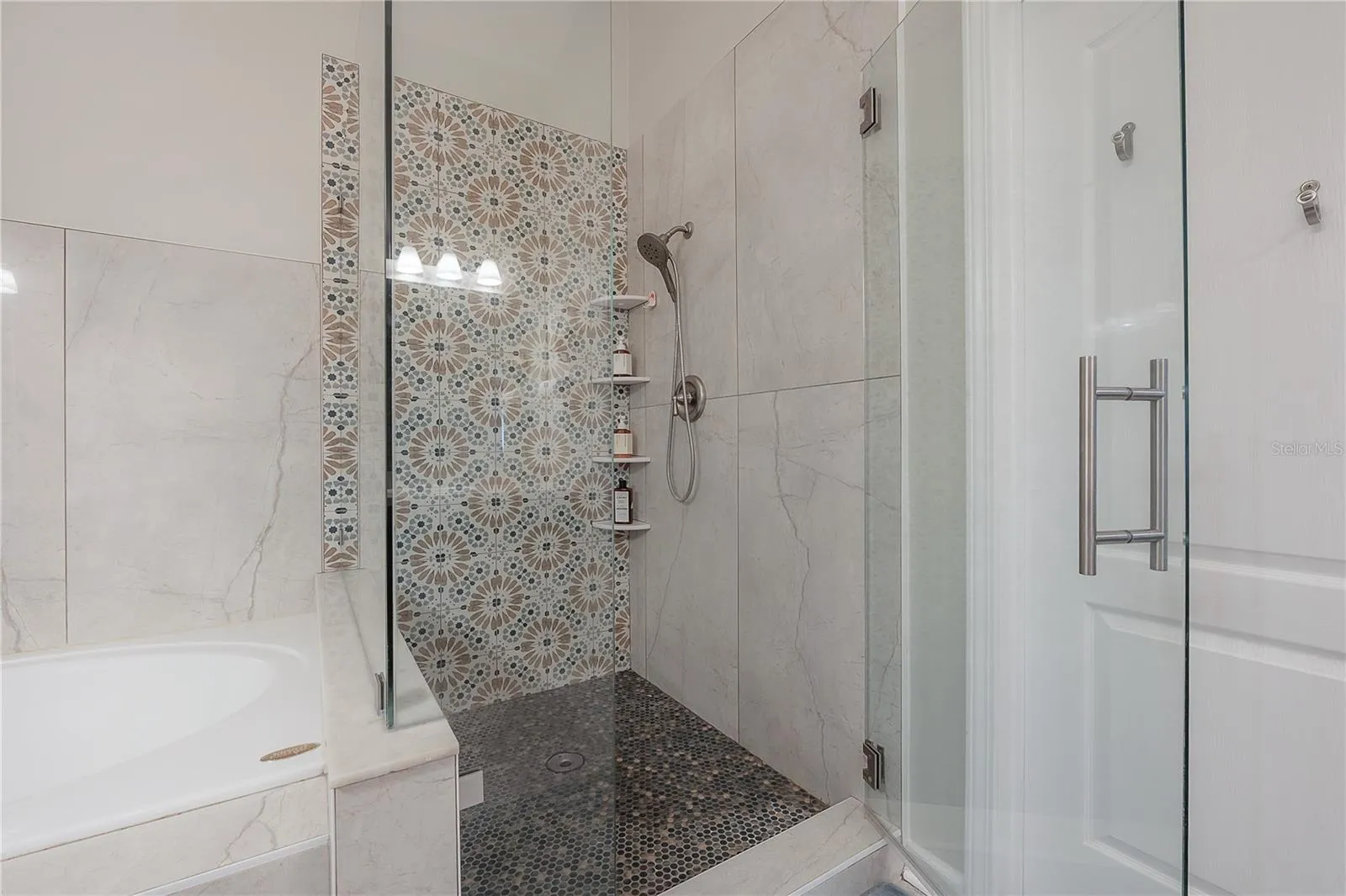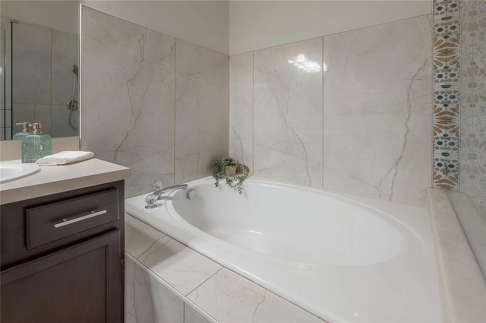 The primary suite offers a true retreat with a double-door entry, a large walk-in closet, and an en suite bath complete with a soaker tub, recently updated glass-enclosed shower, dual-sink vanities with storage, volume ceilings, a linen closet, and a private water closet.