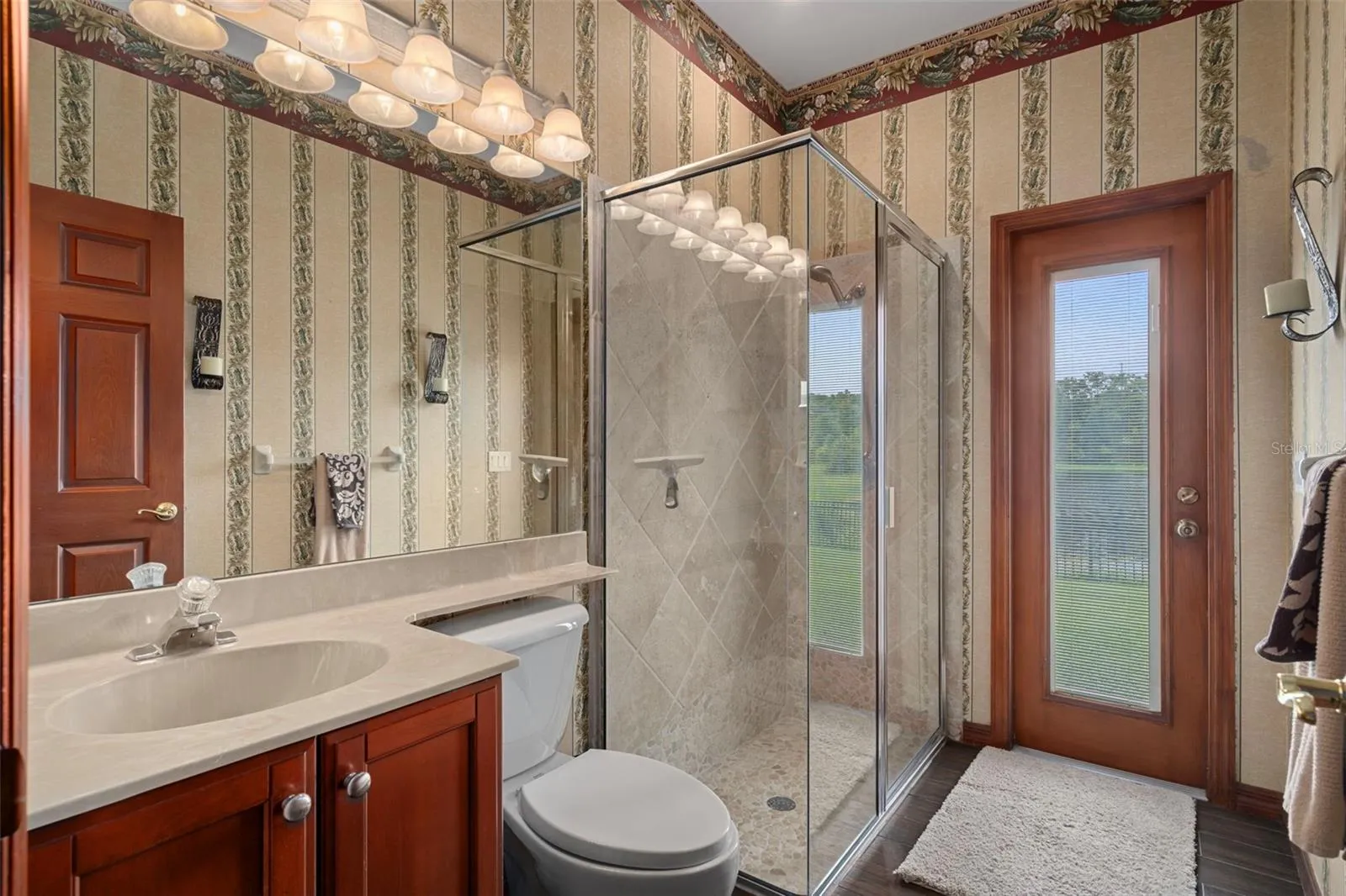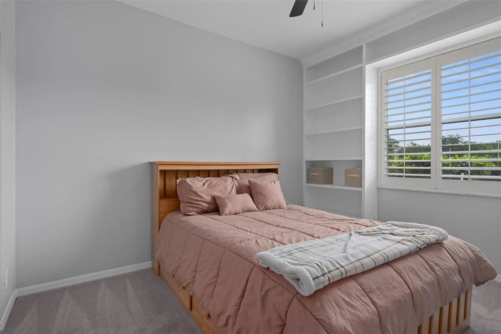 The oversized primary suite features plantation shutters, pool and pond views, and a beautifully updated bath with a walk-in shower, dual vanities, and an expansive custom closet.
