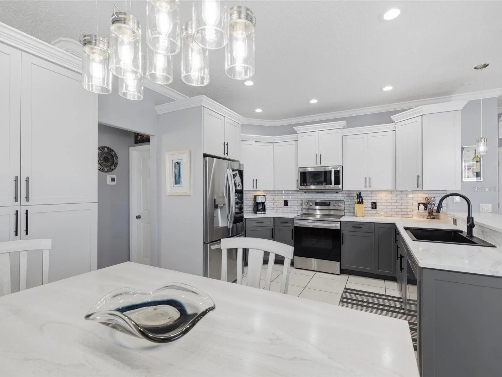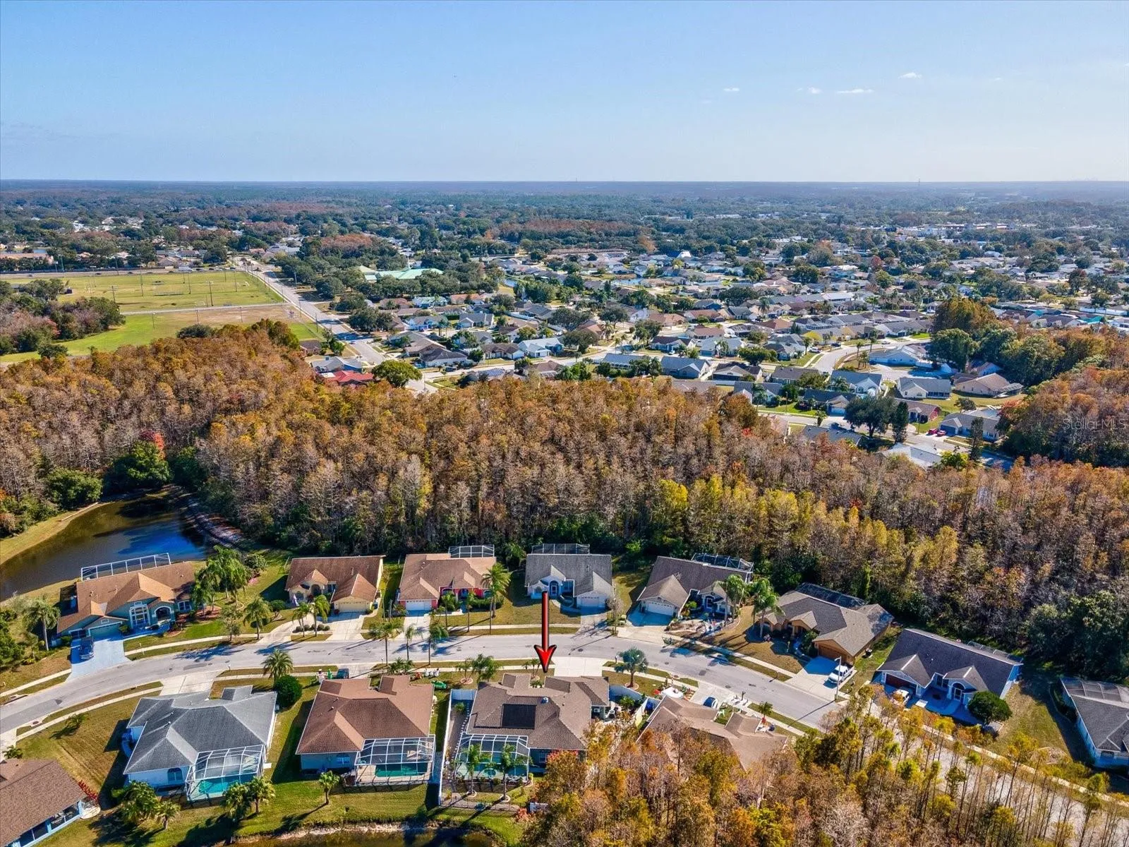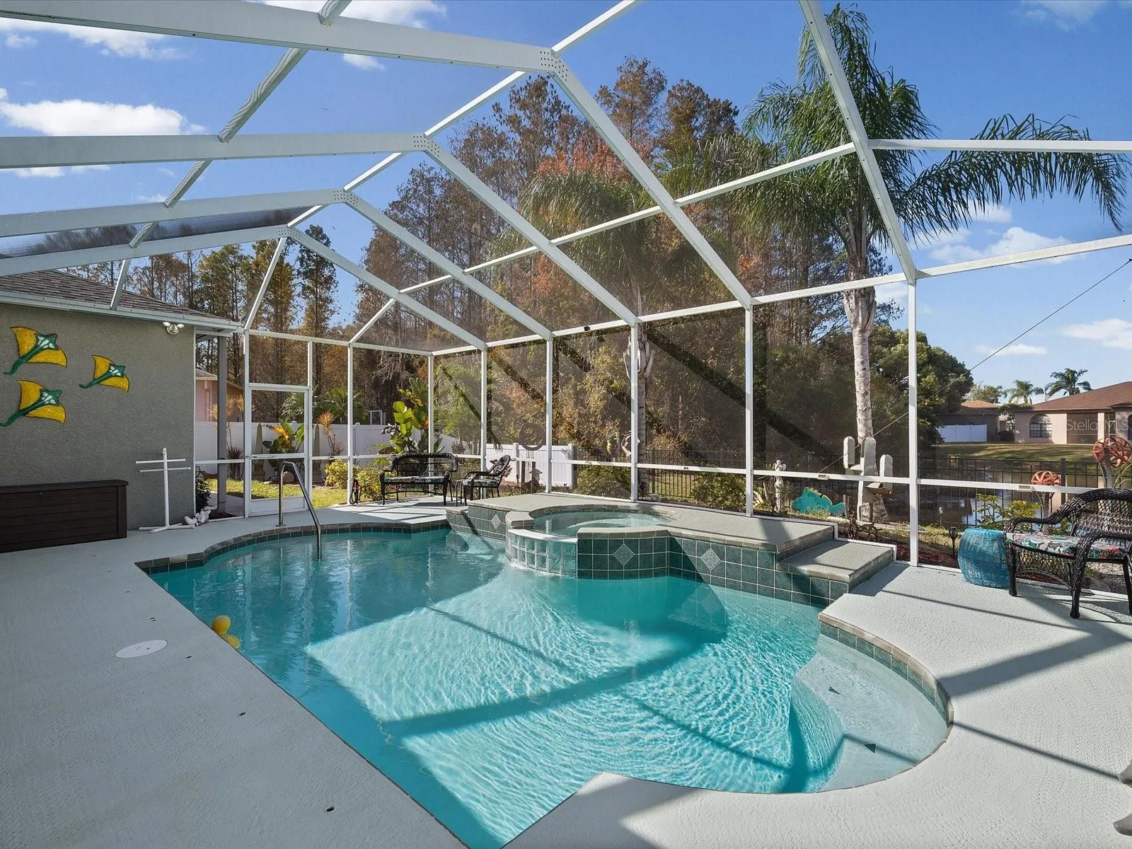 CURB APPEAL & OUTDOOR LIVING! From the moment you arrive, this home captivates with its professionally landscaped grounds featuring a magnificent Bismark palm, mature queen palms and Robellini palms. Along the side of the home, elegant pavers create a perfect setting for evening relaxation around a firepit, while the backyard unfolds into a true oasis overlooking a tranquil pond-an ideal backdrop for peaceful mornings and unforgettable sunsets. RESORT STYLE POOL AND LANAI. The resurfaced salt water solar pool is the centerpiece of the outdoor living space, perfectly positioned to take in serene pond views. New French doors open the home to the outdoors to a 12×28 lanai, creating an effortless indoor-outdoor flow that is perfect for entertaining or everyday enjoyment. INTERIOR LAYOUT & LIVING SPACES- Upon entering, you’re welcomed by a gracious foyer leading into a quiet living room, for reading and relaxation. A formal dining room sits just beyond, inviting for family gatherings and special occasions. The home features a split-bedroom plan, providing privacy and comfort. The primary suite, located at the front of the home is a peaceful retreat complete with a fully remodeled en-suite. At the heart of the home is a gourmet, eat-in kitchen, thoughtfully remodeled and designed for both beauty and function. Crown molding enhances the space while the open plan flows seamlessly into the family room, which enjoys expansive views of the pool and the pond. Two additional rooms are located on the opposite side of the home. One has been transformed into an extraordinary walk-in closet, with boutique -style storage and is easily a third bedroom. THE GARAGE- A TRUE SHOWCASE! Car enthusiasts and hobbyists will appreciate the three-car garage, equipped with a split A/C unit for heating and cooling, allowing it to be a man cave or she cave. A pull-down garage screen adds versatility, and new garage door openers complete the convenience. MORE UPGRADES- hot water tank, commodes, light fixtures, ceiling fans, water softener! This exceptional home has luxury, functionality, and resort style living in every detail. With its breathtaking outdoor spaces, extensive upgrades and thoughtful layout, this is truly a home that must be seen to be believed.