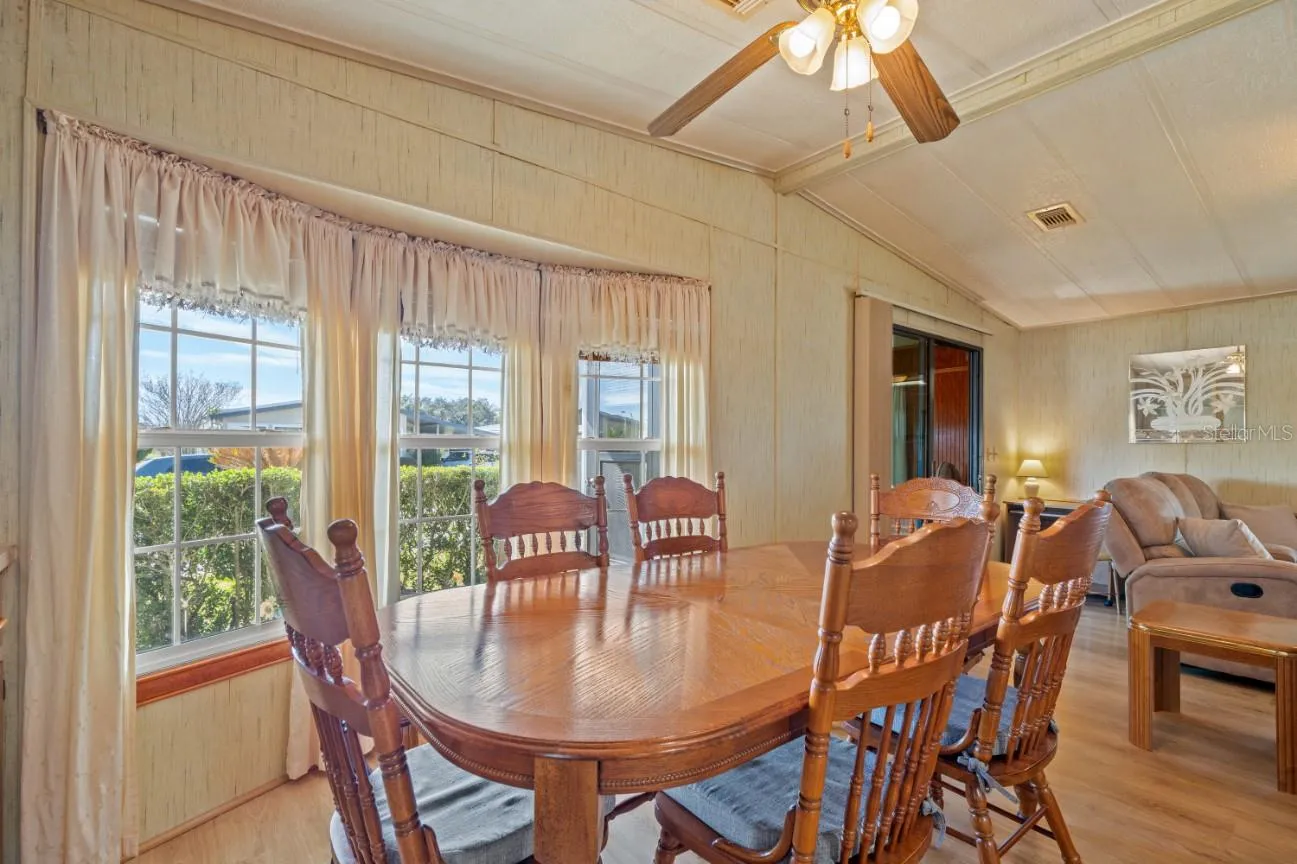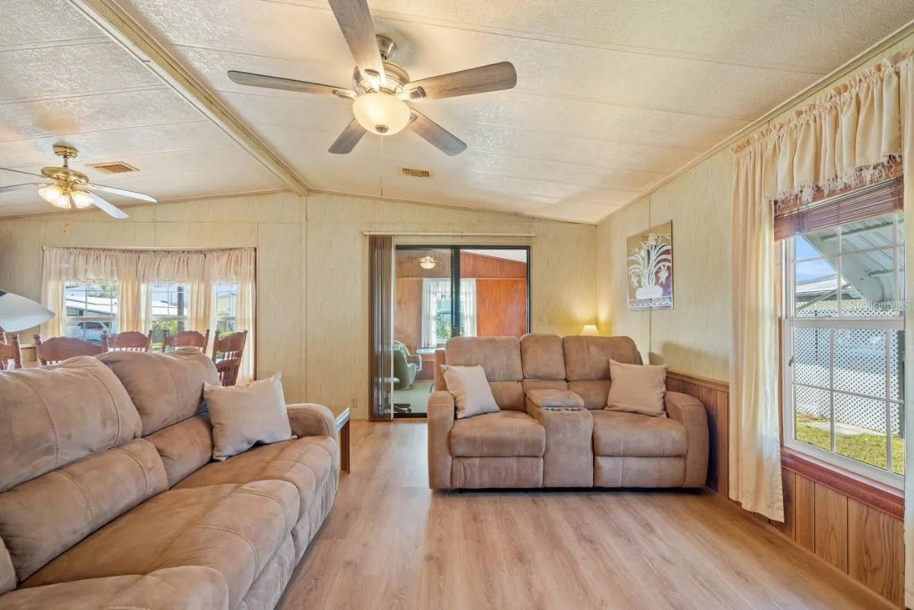 Located in the amenity-rich 55+ community of Colony Hills, where residents own their land, this fully furnished, 2 bedroom, 2 bath manufactured home offers a flexible layout, and valuable improvements that include a brand new 2025 roof, newer flooring and windows throughout, a cozy Florida Room, and an expansive workshop and laundry space. Arrive to a beautifully landscaped home with a 2 car carport that leads inside where the floor plan flows comfortably while still maintaining defined living spaces. The spacious living room connects to the Florida Room through sliding glass doors, creating a bright area well suited for everyday living or casual entertaining. Centrally positioned, the dining room features a ceiling fan, built-in storage, and open views of both the living area and the kitchen. The eat-in kitchen provides pantry storage, a breakfast bar peninsula, easy-care flooring, and a 2019 refrigerator. Both bedrooms are located down the hall for privacy with the primary suite including a walk-in closet and an ensuite bathroom with vanity seating and a walk-in shower. Bedroom two also features a walk-in closet and is conveniently located near the second full bathroom, which offers the added bonus of its own walk-in storage closet, an uncommon and highly practical feature! Major updates include a 2025 roof, 2021 water heater, and 2023 washer, along with newer flooring and windows. Combined with land ownership and an exceptional location within one of the area’s most active and well-established 55+ communities, this home presents an incredible opportunity to have the perfect Florida getaway. Call today for more information and to schedule your private showing!