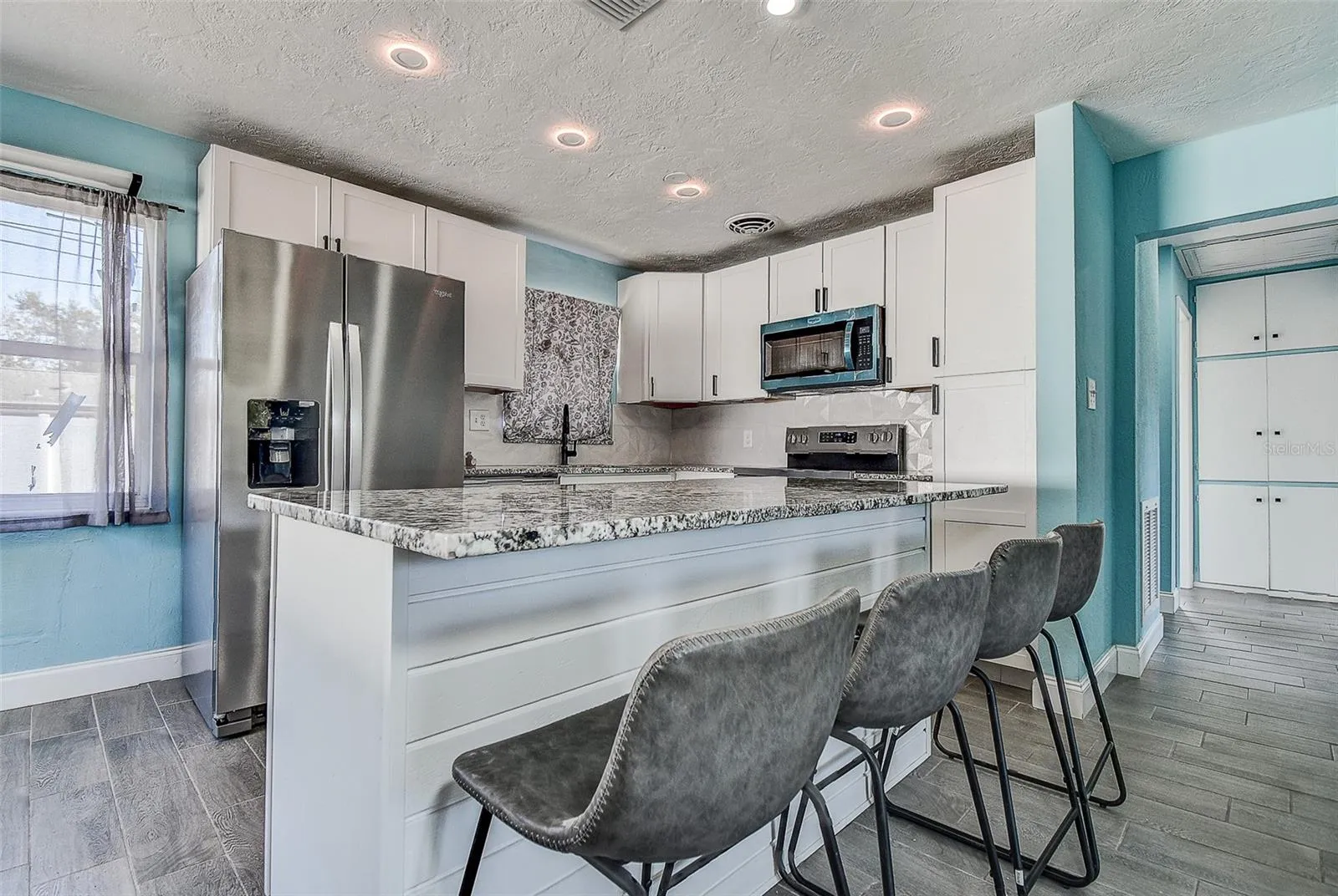Welcome home to this beautifully updated 3 bedroom, 1 bathroom residence that offers modern finishes, thoughtful design, and true move-in-ready appeal. A newer metal roof and fresh exterior paint set the tone for the quality upgrades found throughout. Inside, you’ll be drawn to the stunning, brand new kitchen featuring white shaker cabinetry, Whirlpool stainless steel appliances, gleaming granite countertops, and a large center island ideal for everyday living and entertaining. A custom tiled backsplash and recessed lighting add the perfect finishing touches, while stylish grey ceramic plank tile flows seamlessly through the entire home.