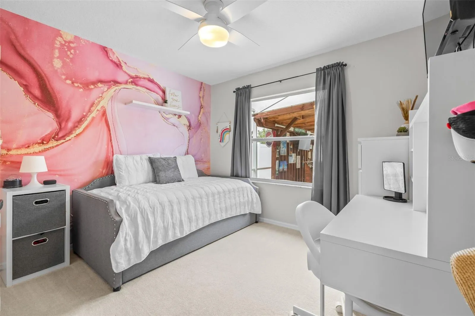 A cheerful stained-glass entry door with keyless access welcomes you inside. The updated kitchen features quartz countertops and newer LG stainless steel appliances, including a refrigerator equipped with both water and air filtration. The large master suite offers direct access to the pool through sliding glass doors, along with a private bath that includes a jetted tub overlooking the pond, a separate shower and water closet, as well as a double vanity.
