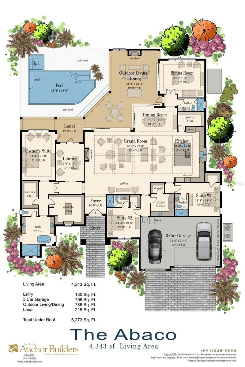 The expansive outdoor living and dining area overlooks the pool and spa and includes a cozy gas fireplace, creating the perfect waterfront entertaining setting. The three-car garage leads into a walk-in laundry room with a dedicated storage closet.
