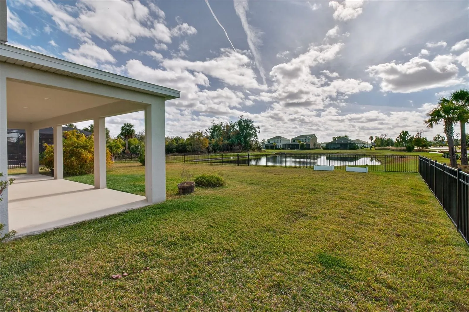 The spacious owner’s suite offers a spa-like bath with upgraded countertops, while thoughtful upgrades throughout the home include a dog wash station, pre-plumb for a water softener, garage attic stairs for extra storage, recessed lighting, ceiling fans, hurricane shutters, and an irrigation system. Step outside to enjoy serene pond views from the large fenced backyard with no rear or side neighbors, along with inviting outdoor spaces that include a charming front porch and a back patio perfect for relaxing or entertaining.