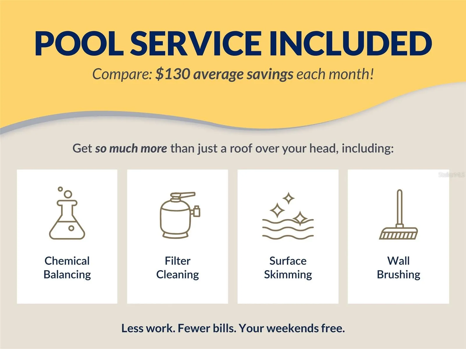 Compare! All landscaping maintenance is included: Mowing, Trimming, Pruning, Fertilization of turf and shrubs, plus plant pest control and irrigation maintenance, even complete pool service – that’s $240/mo in included services!
