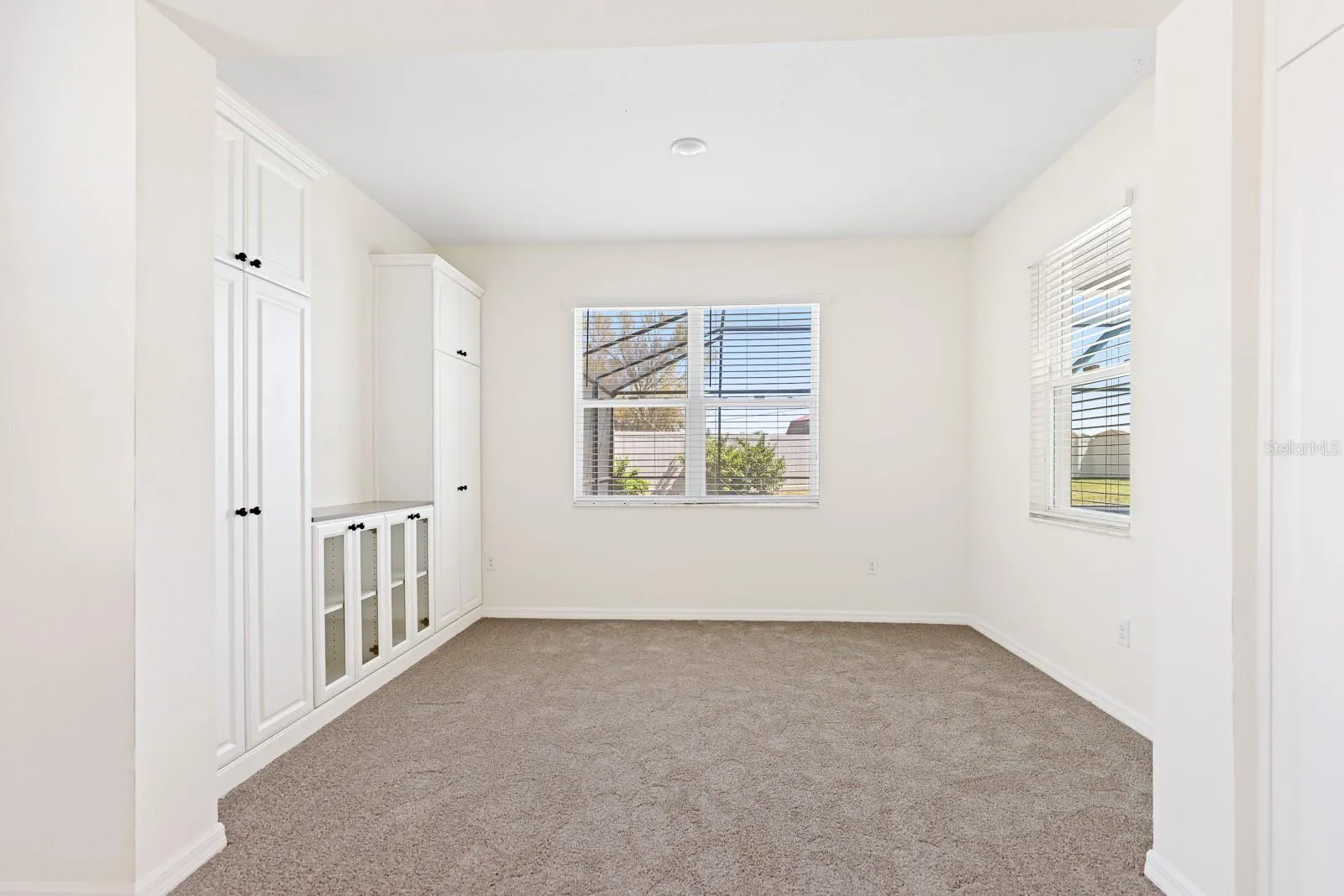 At the front of the home, a French-door entry opens to a versatile office or guest room. Beyond the staircase, a convenient half-bath and a large laundry room with cabinetry, a built-in ironing board, clothes rack, and wet sink add functionality.