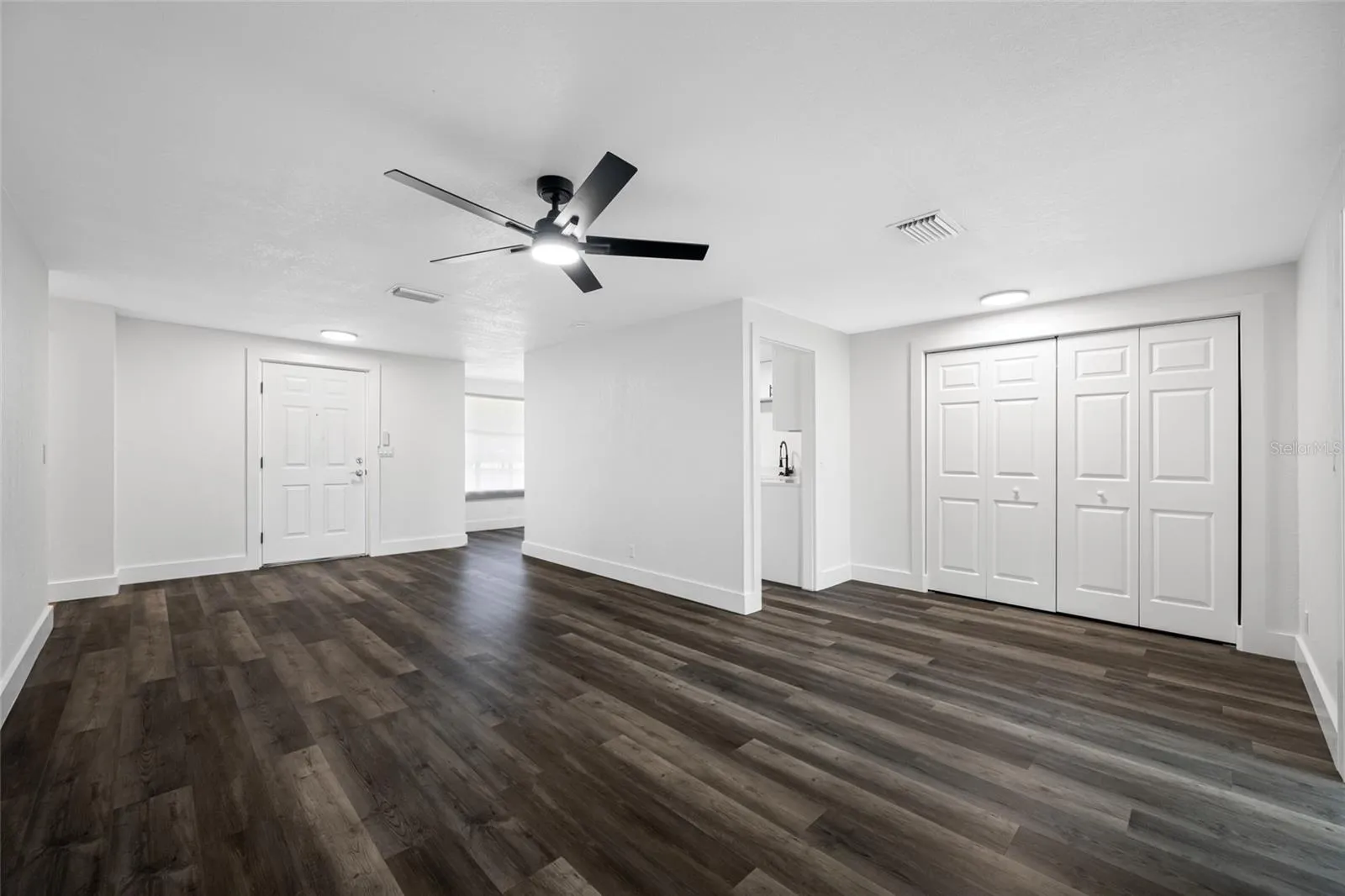 The updated kitchen showcases white cabinetry, stone countertops, and stainless-steel appliances. The front entrance opens to a spacious living and dining area. To the left, you’ll find the kitchen, and to the right, three bedrooms and two full baths.