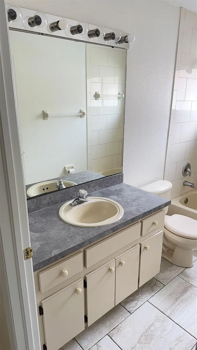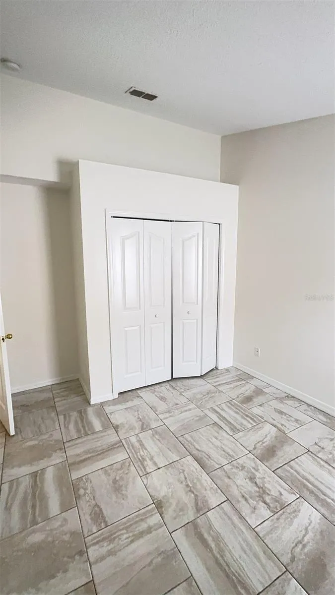 Two secondary bedrooms are located on the other side of the house with a guest bath between them. The guest bath is updated with decorative tile in the combo tub/shower.