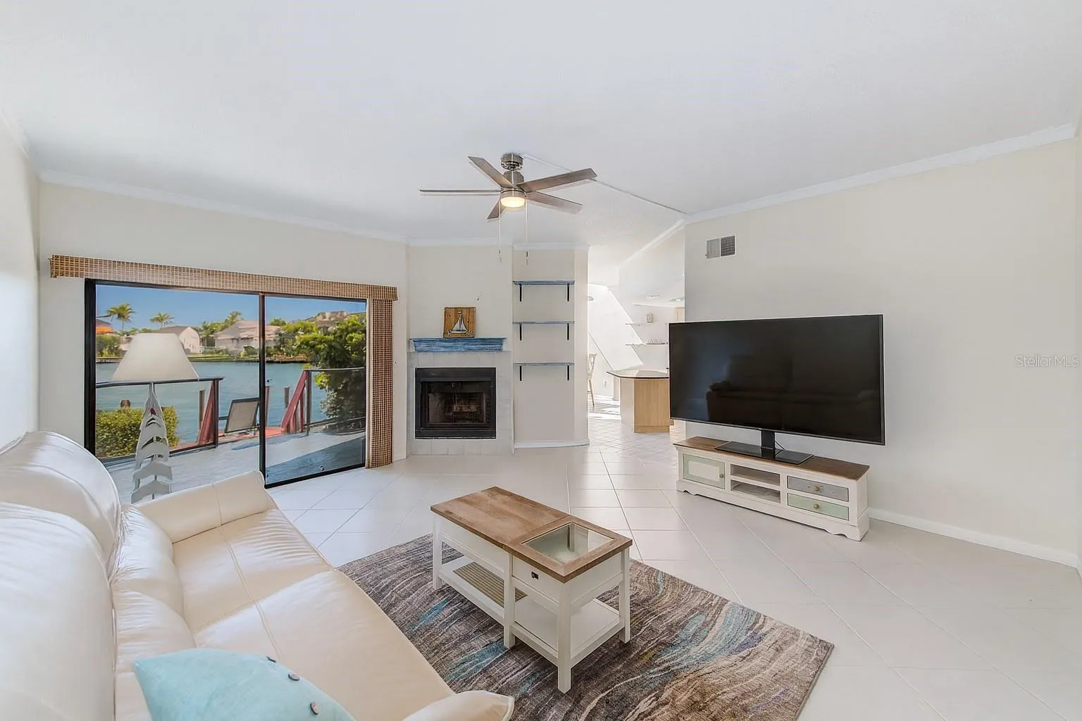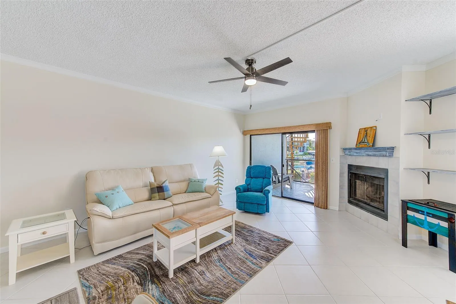 The open-concept living area connects seamlessly to the kitchen and includes a wood-burning fireplace and large sliding glass doors leading to the covered patio. The patio itself boasts beautiful art deco flooring, a bar area, kitchen pass-through, a new ceiling fan, and convenient storage—perfect for entertaining or relaxing outdoors.
