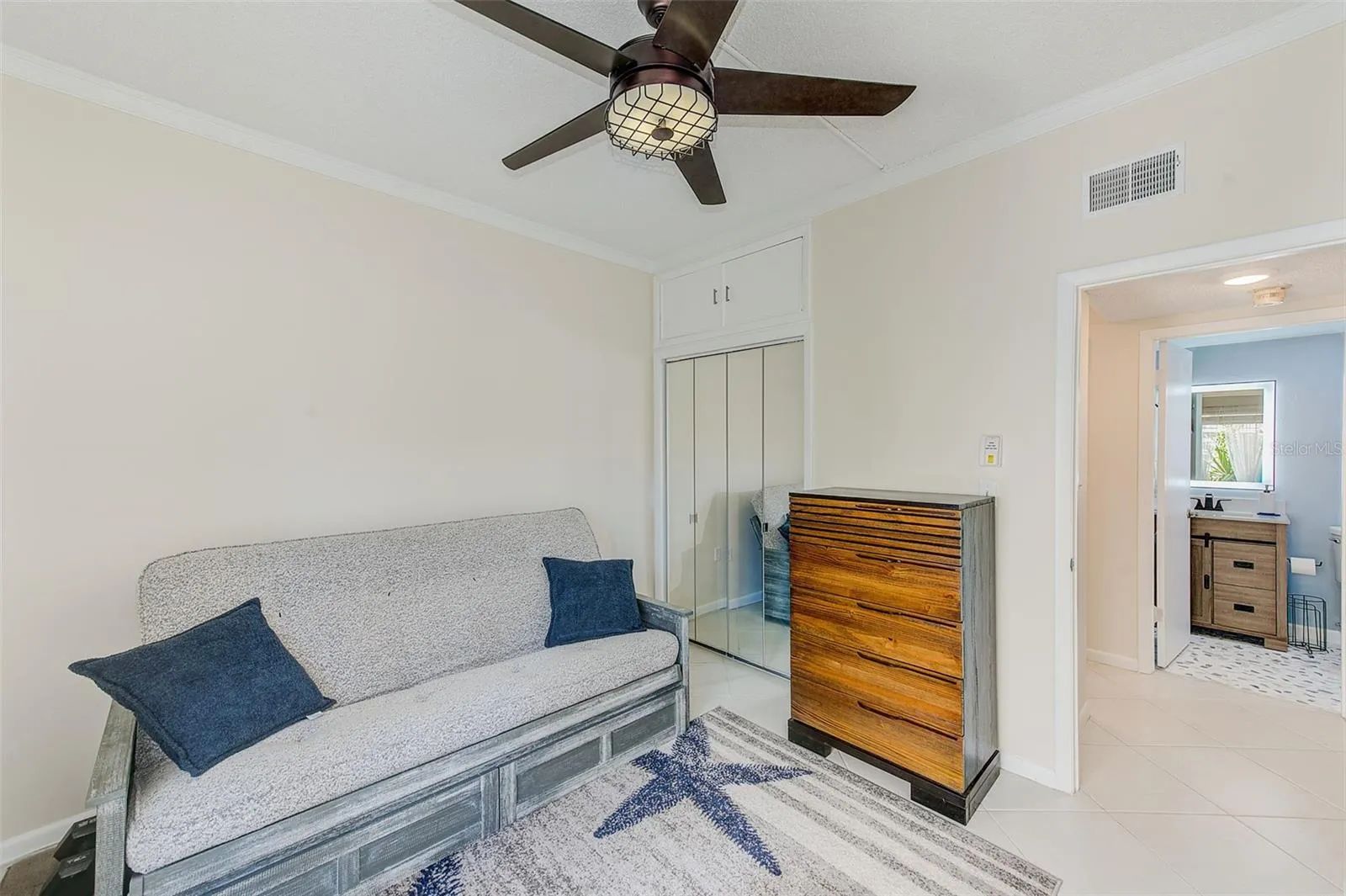 The spacious primary suite offers dual closets and a luxurious ensuite bathroom complete with a modern barn door, double vanity, and floor-to-ceiling tiled standing shower. The secondary bedroom is generous in size, with garden views and abundant natural light. An updated guest bathroom in the hallway features a quartz countertop vanity, updated tub/shower combo and fixtures, pebble flooring, and a lighted mirror.