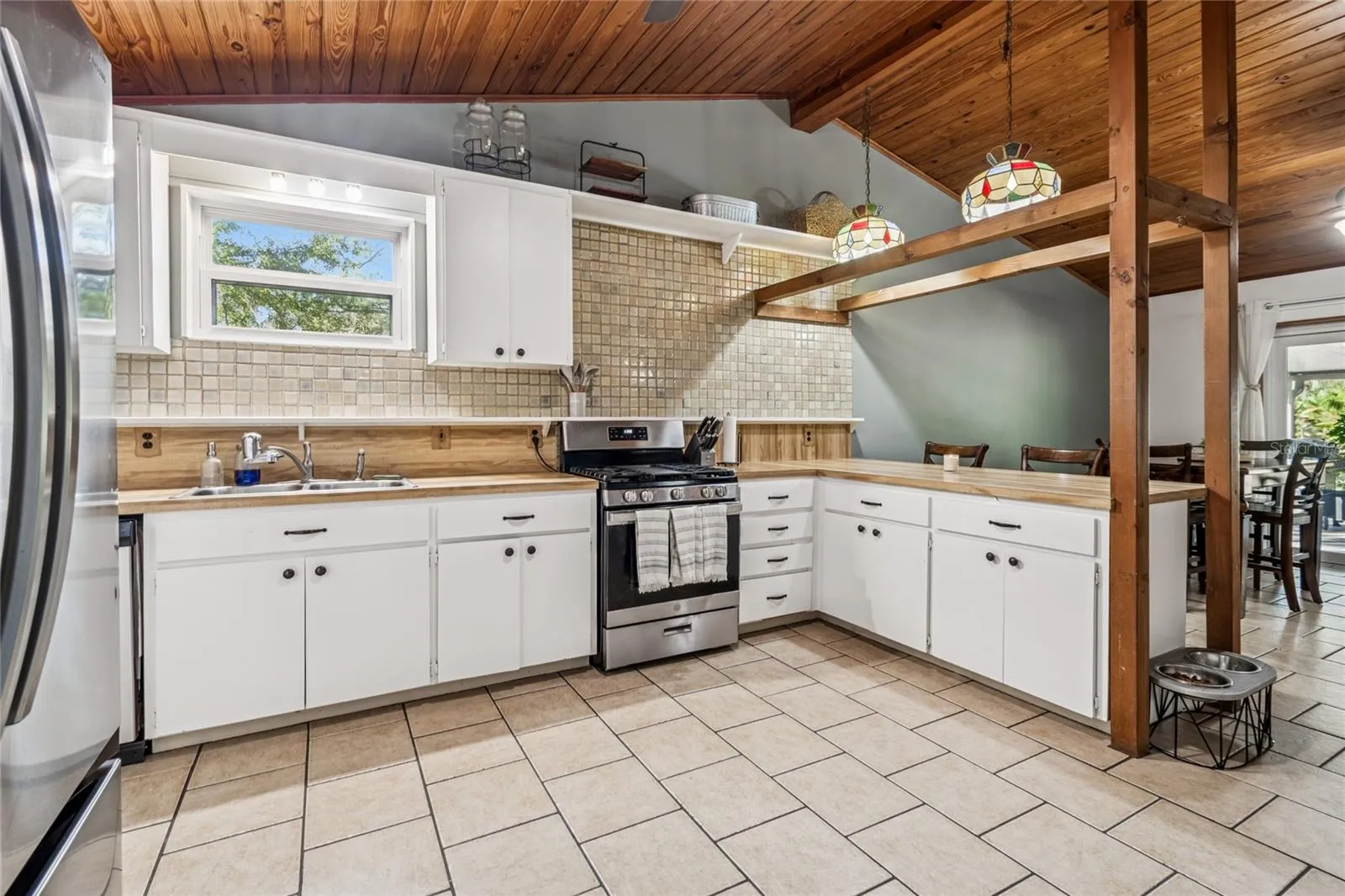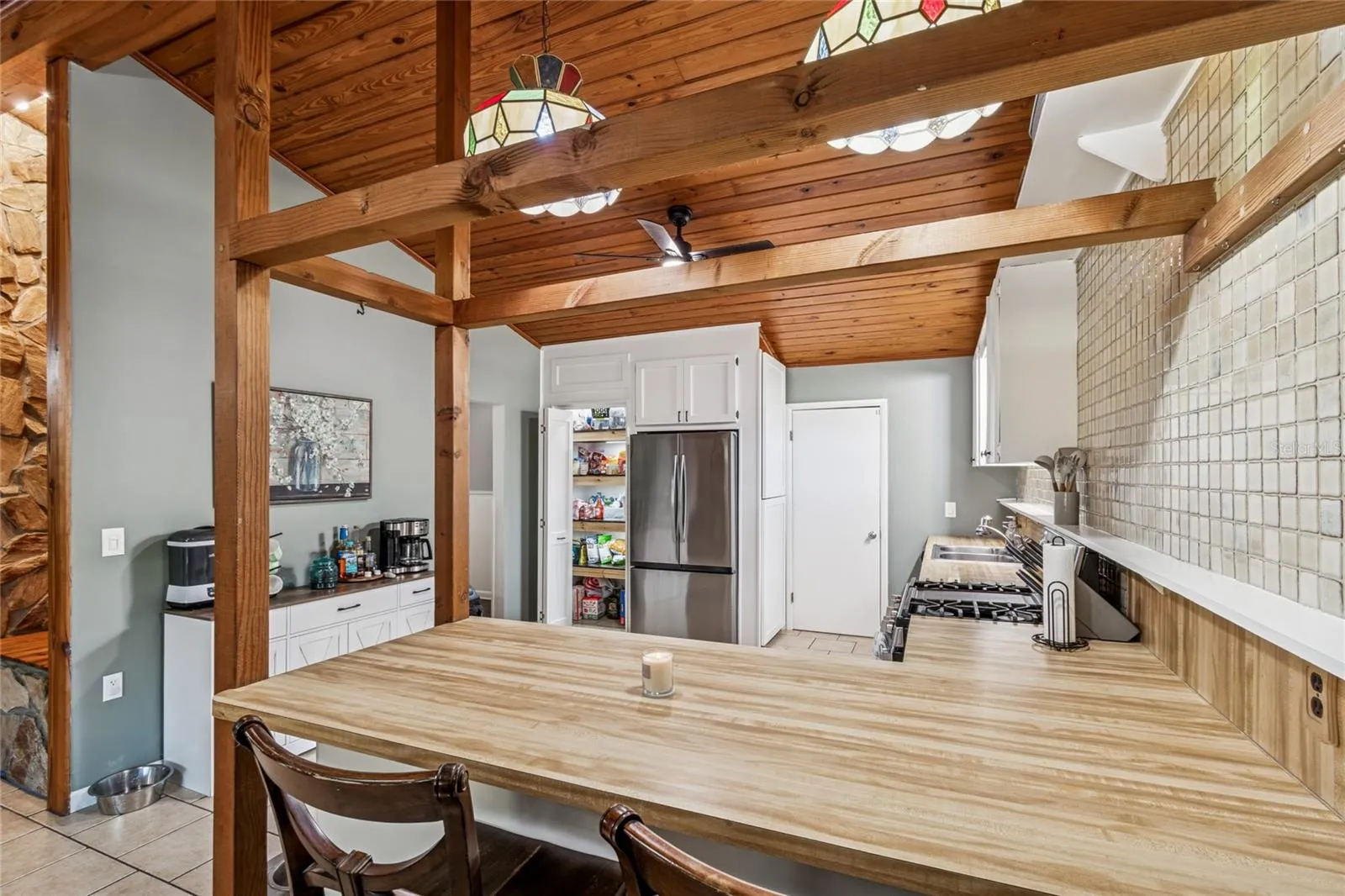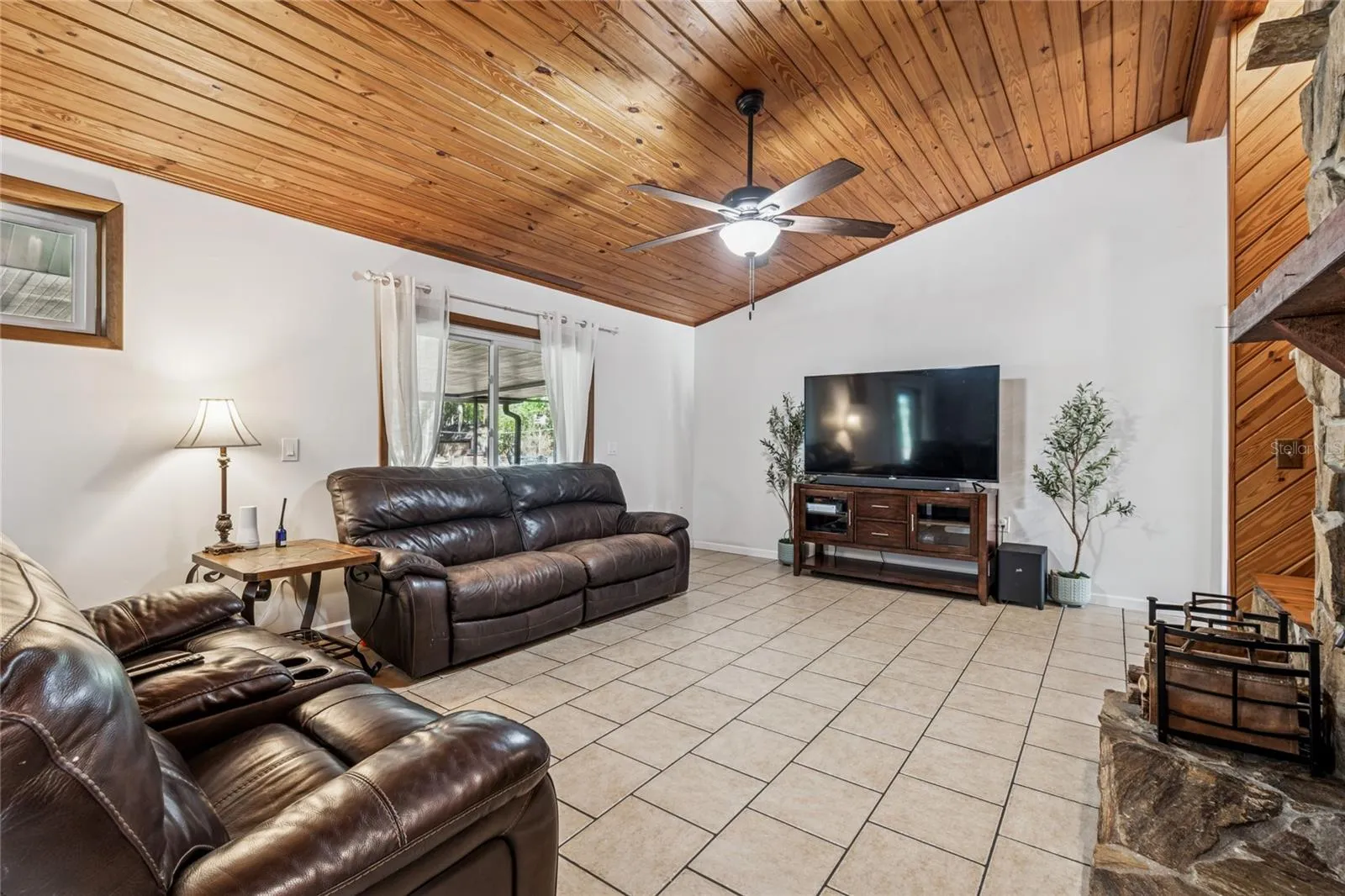 Inside, the home features an inviting open floor plan with high ceilings, updated flooring (2024) in the primary bedroom, guest bedroom, and dining room, and an original stone wood-burning fireplace as the focal point of the family room. The open kitchen offers stainless steel appliances, an eat-in bar, and pantry, while the laundry room includes a newer washer and dryer (2025).