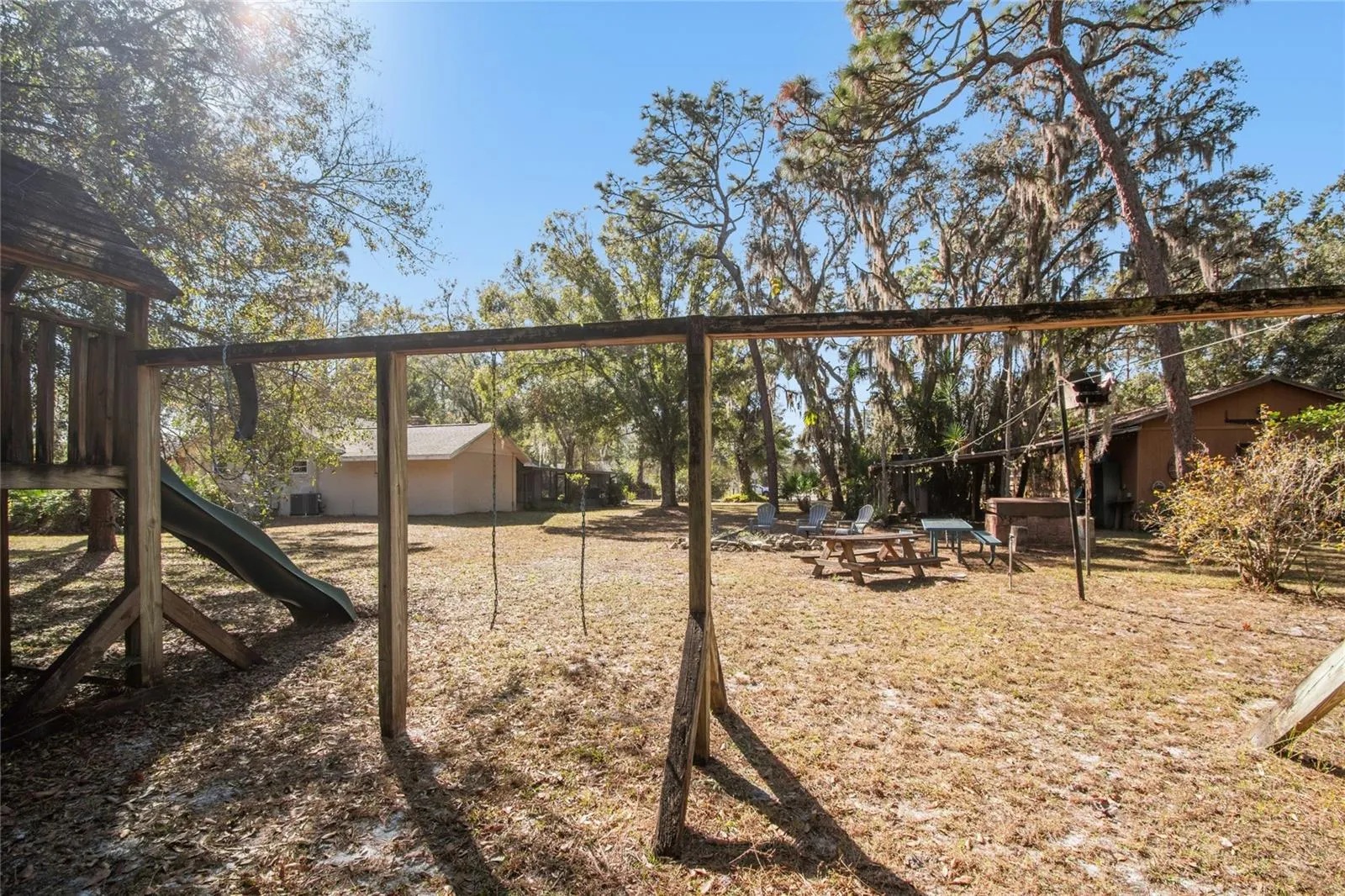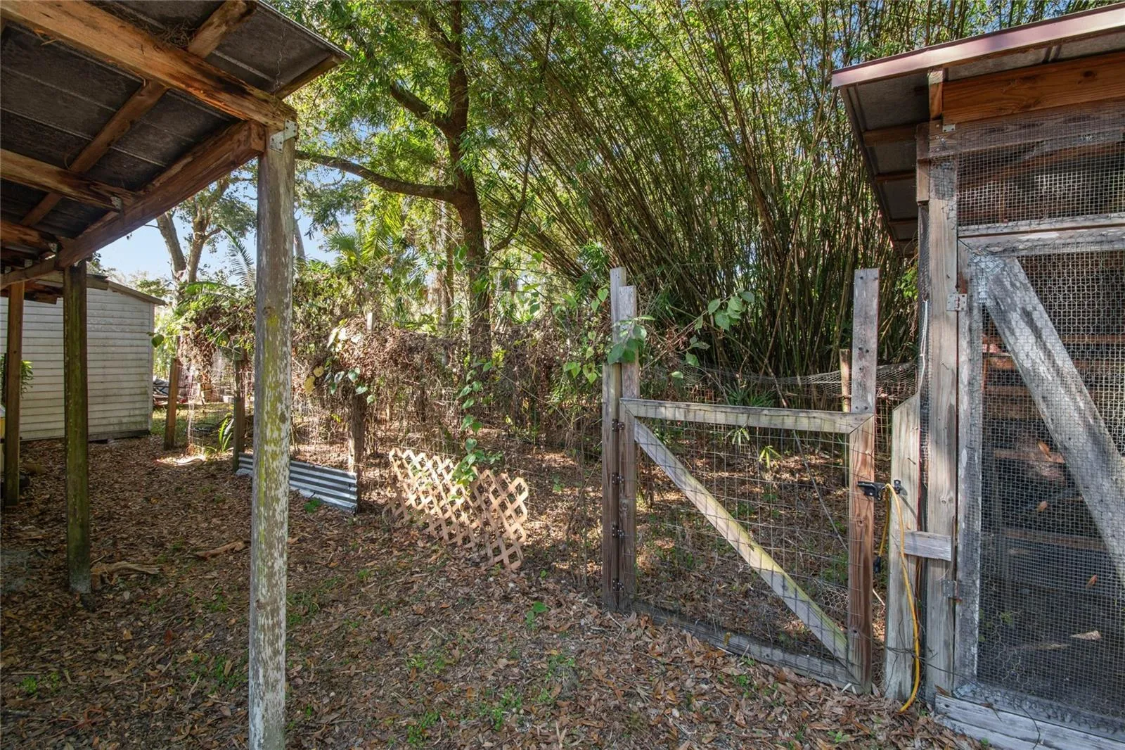 The fully fenced property is thoughtfully designed for both everyday living and recreational use. A versatile pole barn and enclosed barn are wired with lighting and electrical hookup, ideal for RV/boat storage and workshop. The pole barn includes a 50-amp RV connection and private septic-tied dump site, plus a covered side area — perfect for an outdoor kitchen, bar, or entertainment space. Additional exterior features include a large fire pit for gatherings, rear-lot gate access with ample space for boat and trailer parking, and a spacious walk-in chicken coop with fenced run.