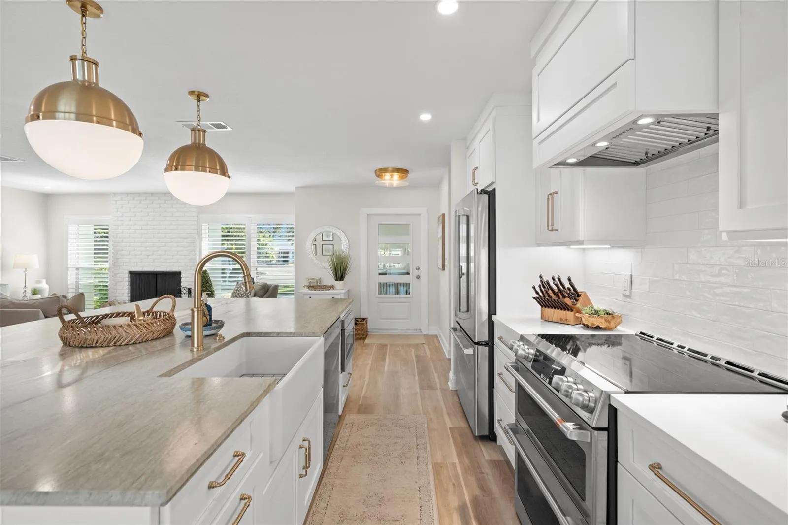 Step inside to an atmosphere of modern elegance. The completely reimagined open-concept interior showcases a brand-new designer kitchen appointed with premium Café appliances, a massive quartz island with built-in storage, brass fixtures, and custom lighting. Expansive windows and sliding doors draw in natural light and connect the kitchen, dining, and living areas to the sparkling water beyond—perfect for effortless entertaining.