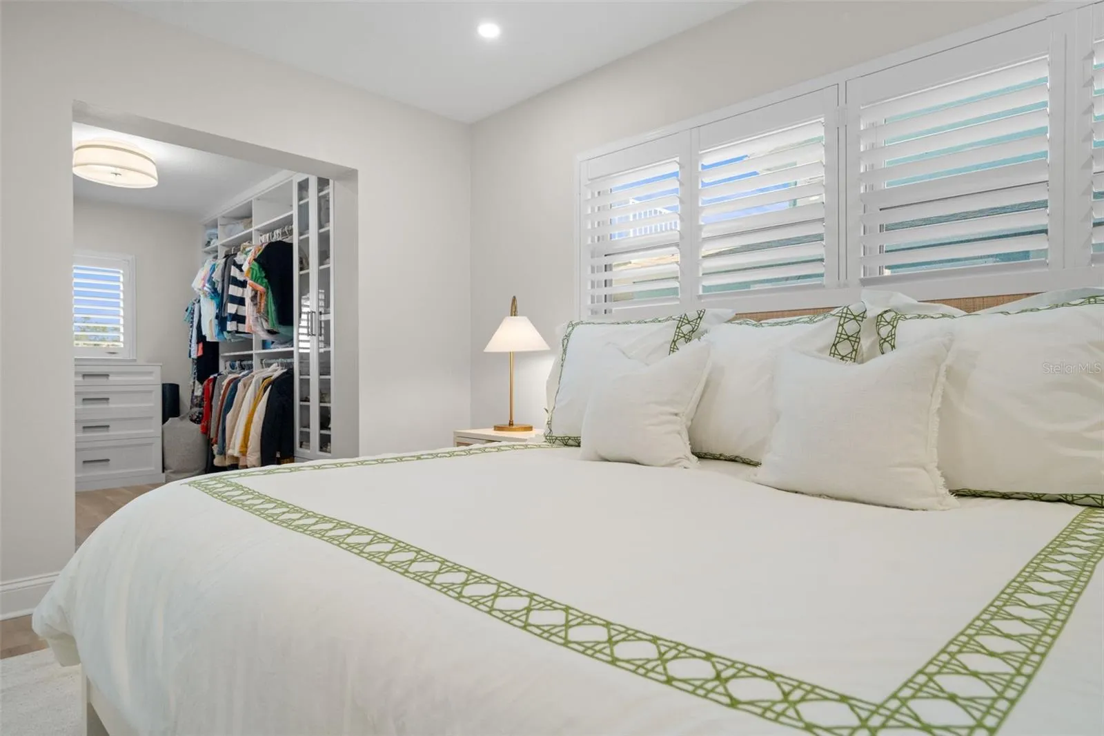 The primary suite is a serene retreat with designer closets and a spa-like ensuite bathroom featuring custom tile, premium fixtures, and sophisticated finishes. The third bedroom doubles as an elegant office, enhanced with custom-built cabinetry ideal for storage and organization.
