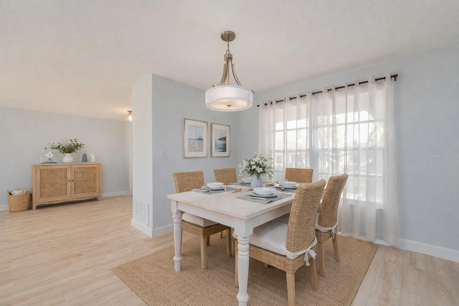 - Ceiling Fans(s), Open Floorplan, Thermostat, Living Room/Dining Room Combo, Eat-in Kitchen, Window Treatments