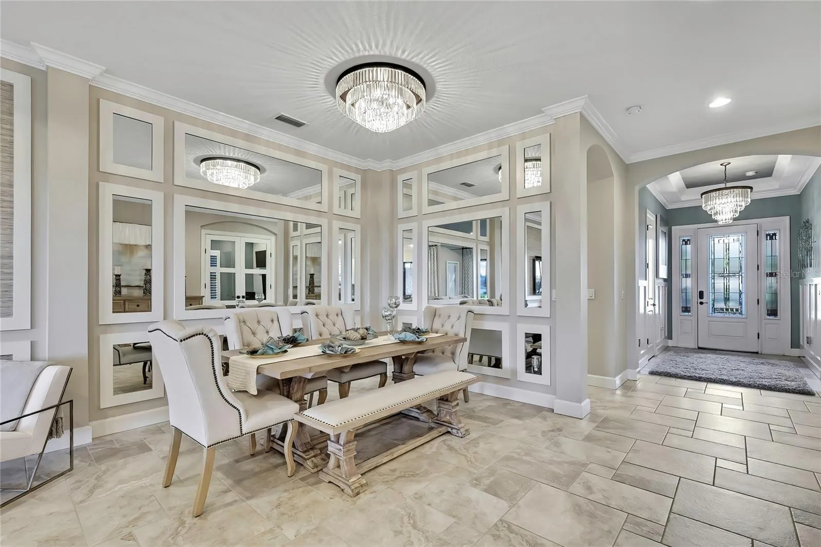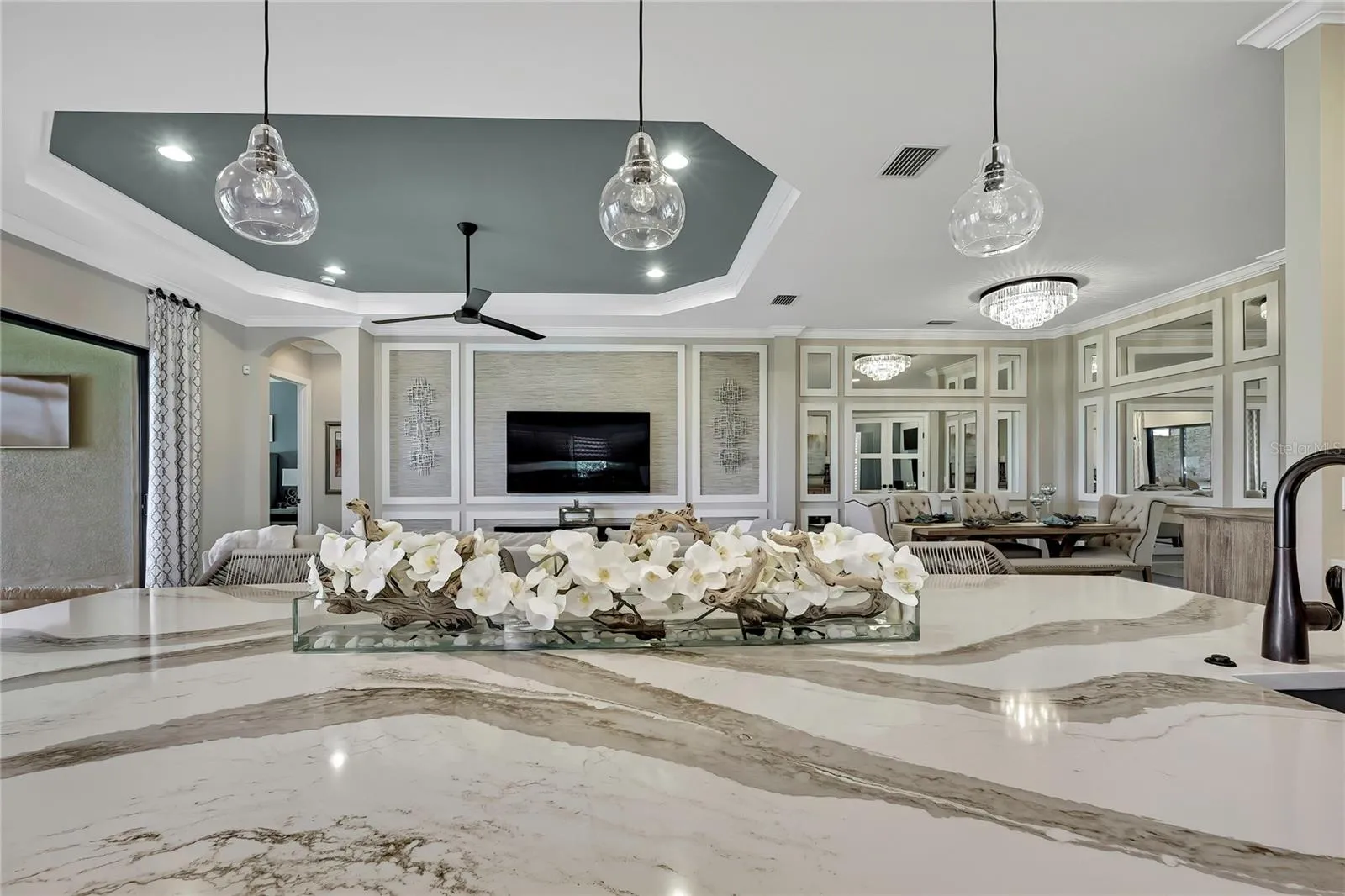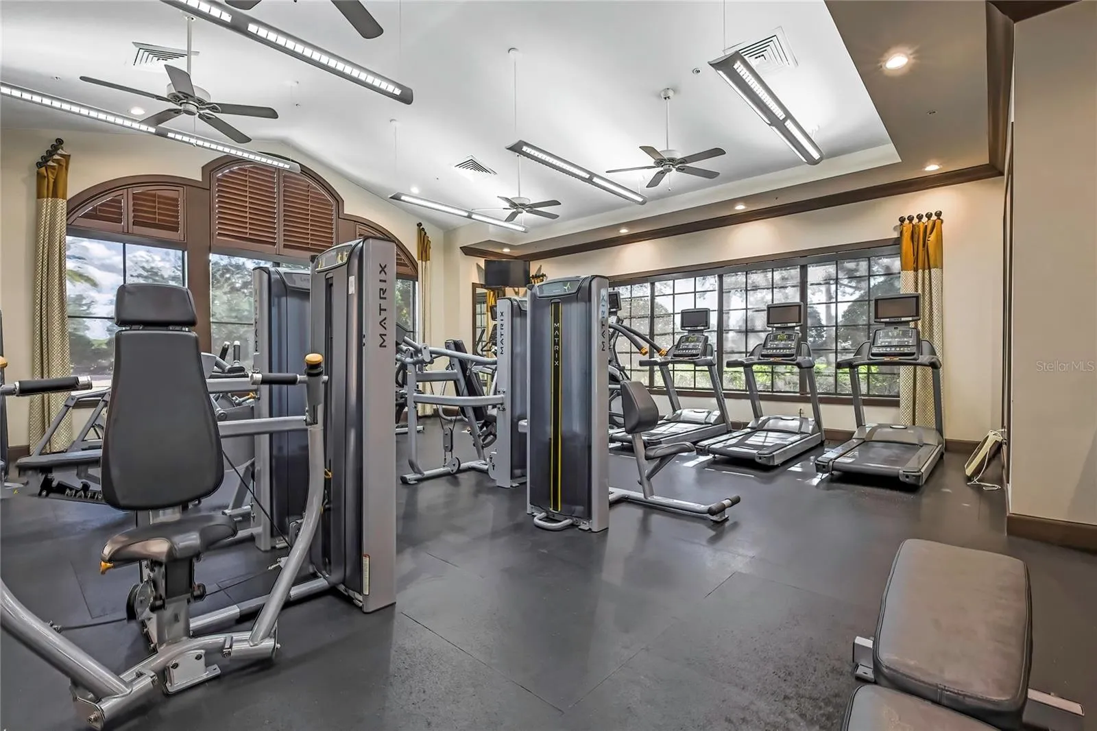 - Ceiling Fans(s), Crown Molding, Open Floorplan, Thermostat, Walk-In Closet(s), Living Room/Dining Room Combo, Eat-in Kitchen, Primary Bedroom Main Floor, Split Bedroom, Window Treatments, High Ceilings, Solid Wood Cabinets, Solid Surface Counters, Tray Ceiling(s)