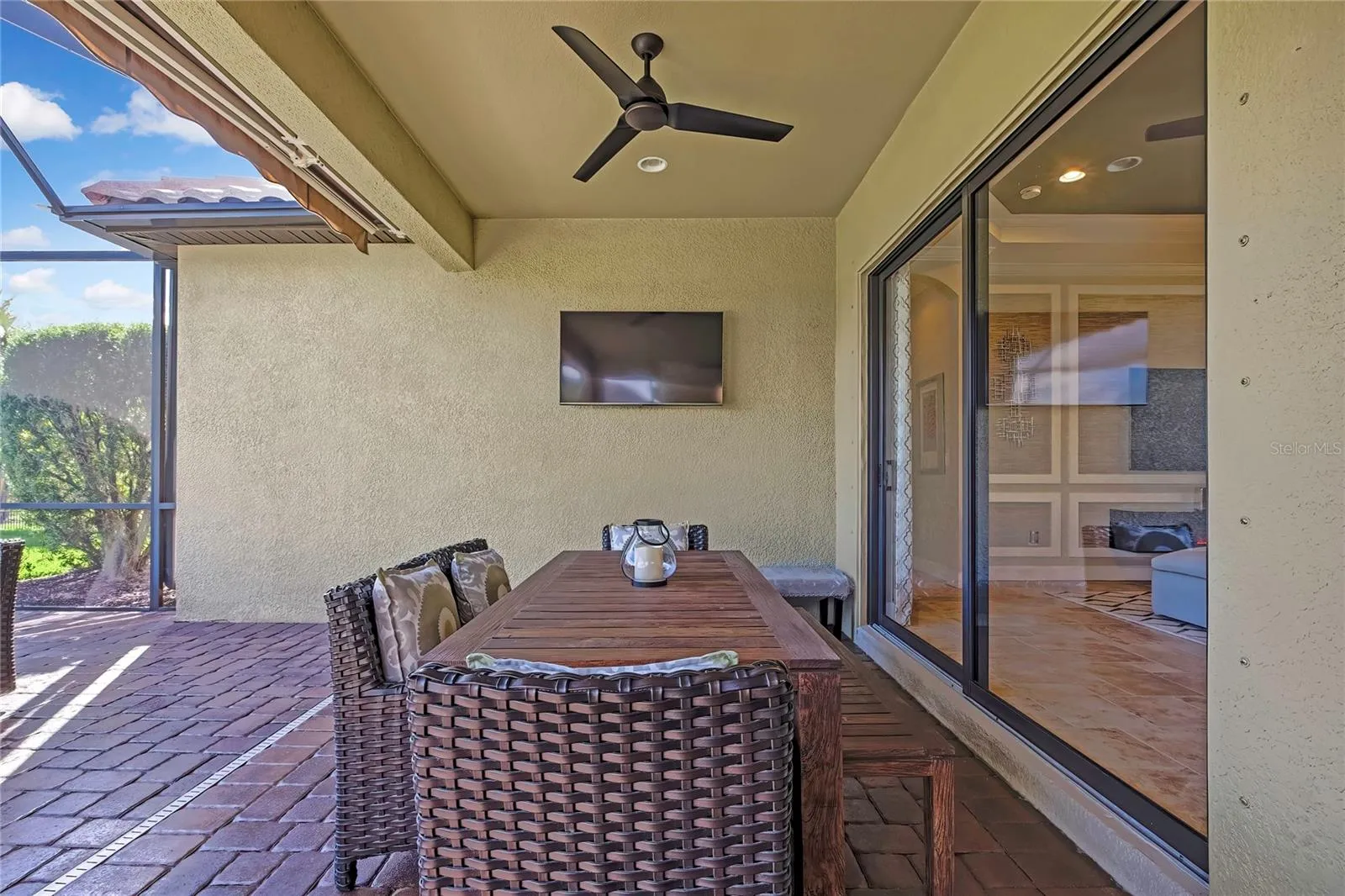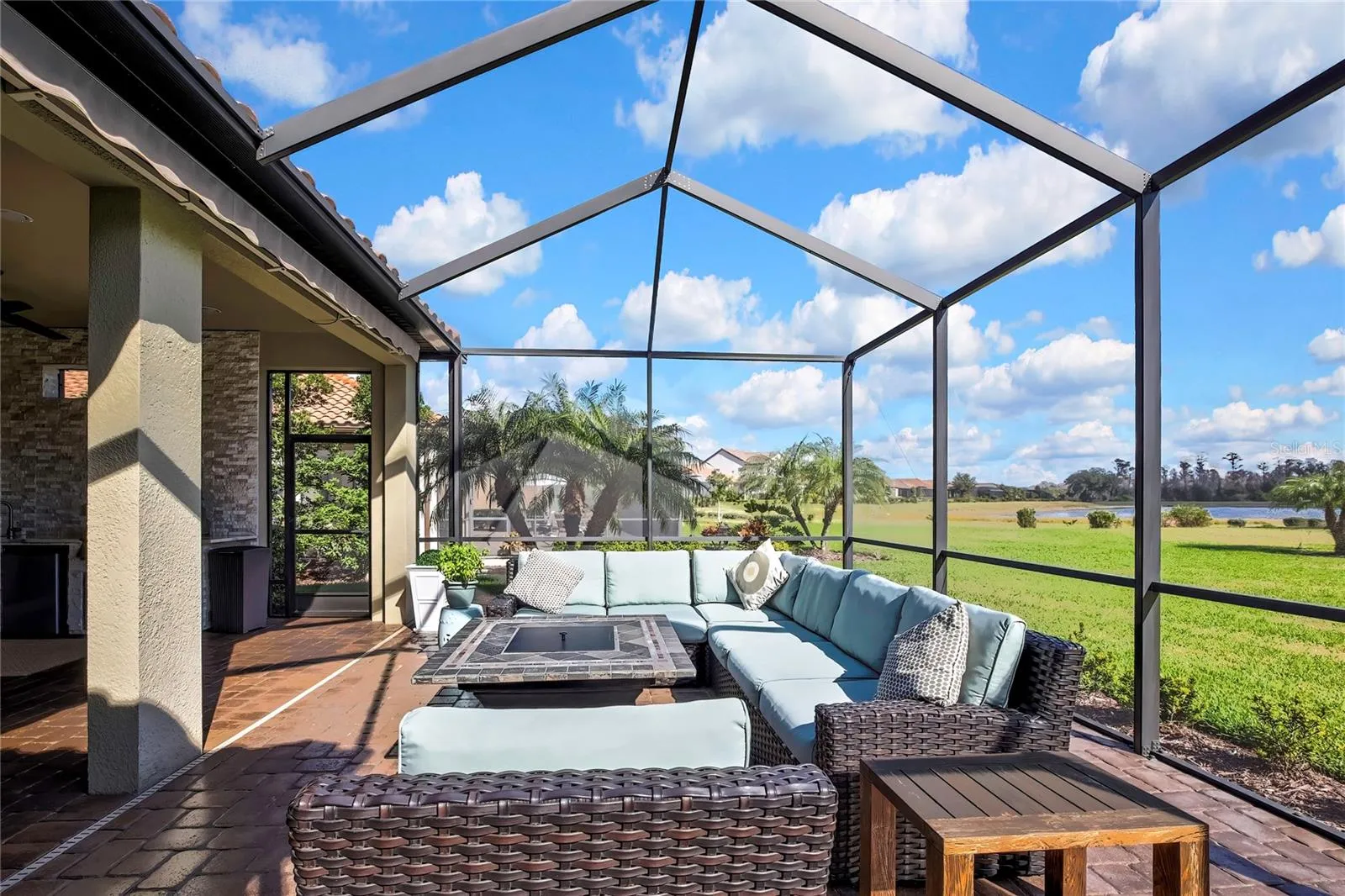 - Lighting, Sidewalk, Sliding Doors, Other, Hurricane Shutters, Outdoor Grill, Outdoor Kitchen, Awning(s), Gray Water System